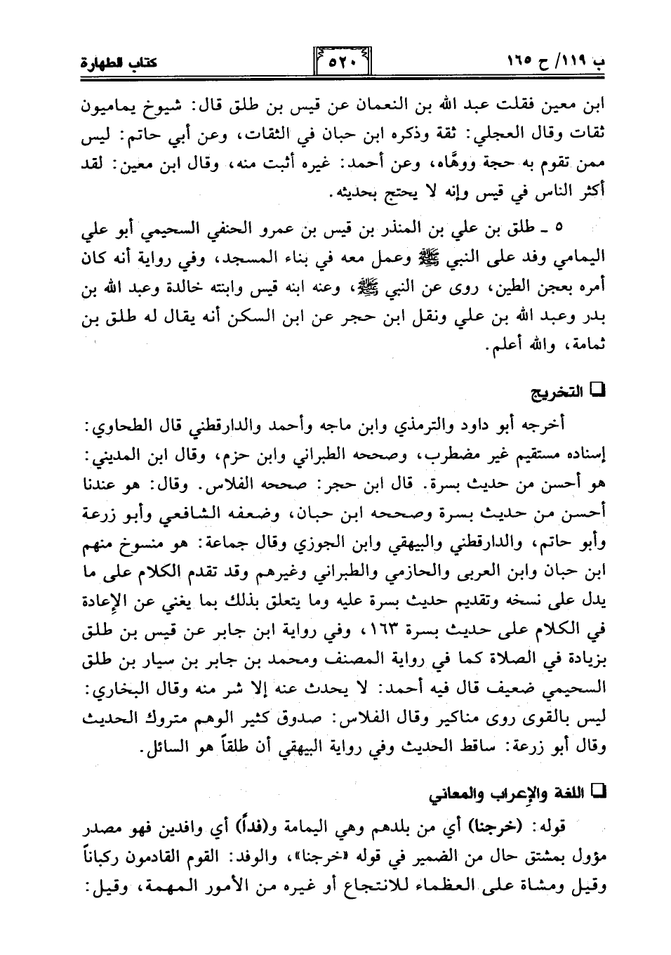 أخرجه أبو داود والترمذي وابن ماجه وأحمد والدارقطني قال الطحاوي: إسناده مستقيم غير مضطرب، وصححه الطبراني وابن حزم، وقال ابن المديني: هو أحسن من حديث بسرة. قال ابن حجر: صححه الفلاس. وقال: هو عندنا أحسن من حديث بسرة وصححه ابن حبان، وضعفه الشافعي وأبو زرعة وأبو حاتم، والدارقطني والبيهقي وابن الجوزي وقال جماعة: هو منسوخ منهم ابن حبان وابن العربي والحازمي والطبراني وغيرهم وقد تقدم الكلام على ما يدل على نسخه وتقديم حديث بسرة عليه وما يتعلق بذلك بما يغني عن الإِعادة في الكلام على حديث بسرة 163، وفي رواية ابن جابر عن قيس بن طلق بزيادة في الصلاة كما في رواية المصنف ومحمد بن جابر بن سيار بن طلق السحيمي ضعيف قال فيه أحمد: لا يحدث عنه إلا شر منه وقال البخاري: ليس بالقوي روى مناكير وقال الفلاس: صدوق كثير الوهم متروك الحديث وقال أبو زرعة: ساقط الحديث وفي رواية البيهقي أن طلقًا هو السائل.
