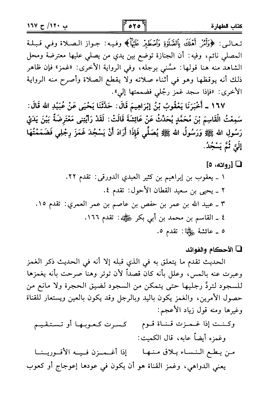 167 - أَخْبَرَنَا يَعْقُوبُ بْنُ إِبْرَاهِيمَ قَالَ: حَدَّثَنَا يَحْيَى عَنْ عُبَيْدِ اللَّهِ قَالَ: سَمِعْتُ الْقَاسِمَ بْنَ مُحَمَّدٍ يُحَدِّثُ عَنْ عَائِشَةَ قَالَتْ: لَقَدْ رَأَيْتُنِي مُعْتَرِضَةً بَيْنَ يَدَيْ رَسُولِ اللَّهِ - صلى الله عليه وسلم - وَرَسُولُ اللَّهِ - صلى الله عليه وسلم - يُصَلِّي فَإِذَا أَرَادَ أَنْ يَسْجُدَ غَمَزَ رِجْلِي فَضَمَمْتُهَا إِلَيَّ ثُمَّ يَسْجُدُ.
