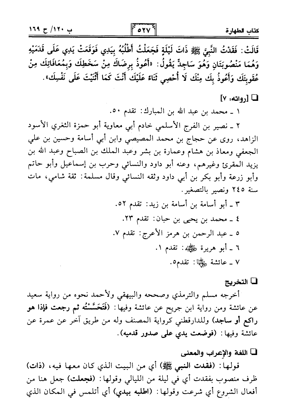 أخرجه مسلم والترمذي وصححه والبيهقي ولأحمد نحوه من رواية سعيد عن عائشة ومن رواية ابن جريح عن عائشة وفيها: (فَتَحَسَّسْتُه ثم رجعت فإذا هو راكع أو ساجد) وللدارقطني كرواية المصنف وله من طريق آخر عن عمرة عن عائشة وفيها: (فوضعت يدي على صدور قدميه).