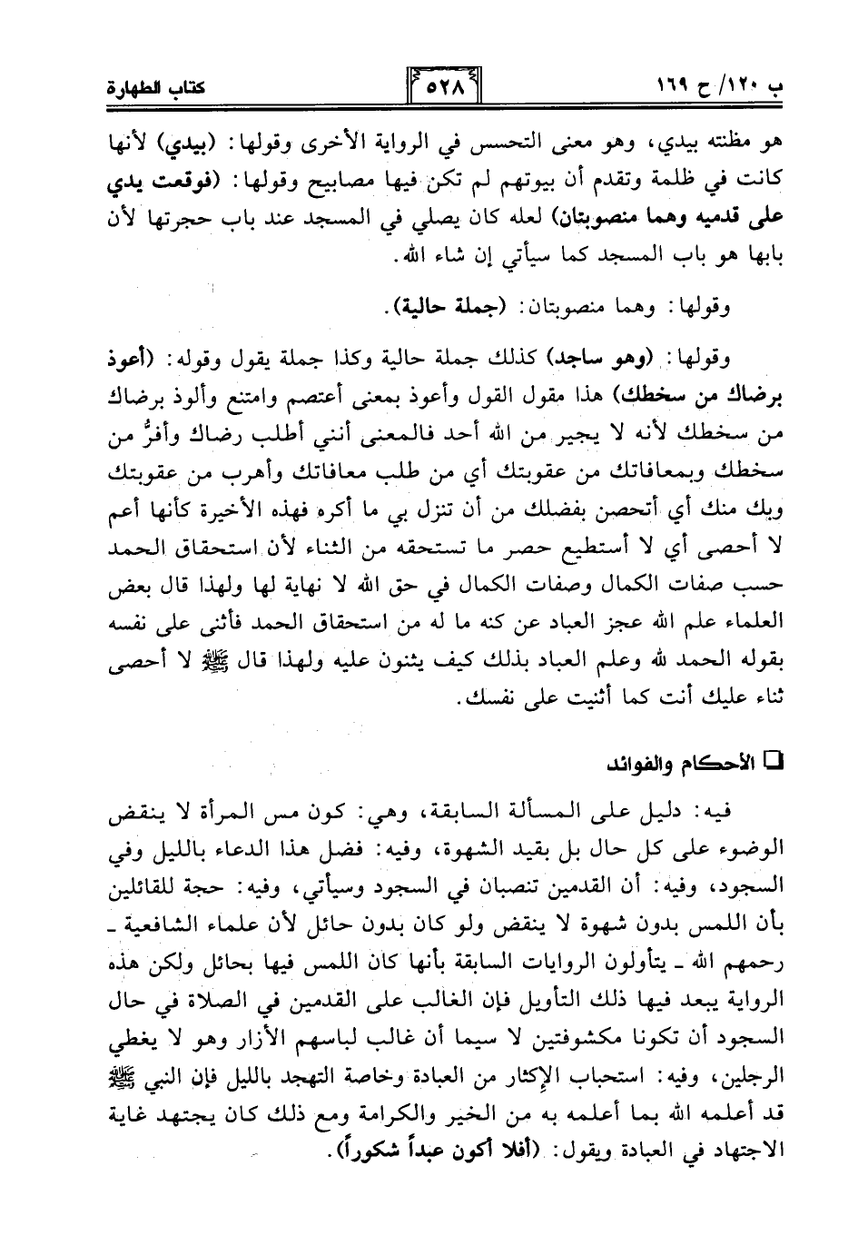 فيه: دليل على المسألة السابقة، وهي: كون مس المرأة لا ينقض الوضوء على كل حال بل بقيد الشهوة، وفيه: فضل هذا الدعاء بالليل وفي السجود، وفيه: أن القدمين تنصبان في السجود وسيأتي، وفيه: حجة للقائلين بأن اللمس بدون شهوة لا ينقض ولو كان بدون حائل لأن علماء الشافعية -رحمهم الله- يتأولون الروايات السابقة بأنها كان اللمس فيها بحائل ولكن هذه الرواية يبعد فيها ذلك التأويل فإن الغالب على القدمين في الصلاة في حال السجود أن تكونا مكشوفتين لاسيما أن غالب لباسهم الأزار وهو لا يغطي الرجلين، وفيه: استحباب الإِكثار من العبادة وخاصة التهجد بالليل فإن النبي - صلى الله عليه وسلم - قد أعلمه الله بما أعلمه به من الخير والكرامة ومع ذلك كان يجتهد غاية الاجتهاد في العبادة ويقول: (أفلا أكون عبدًا شكورًا).
