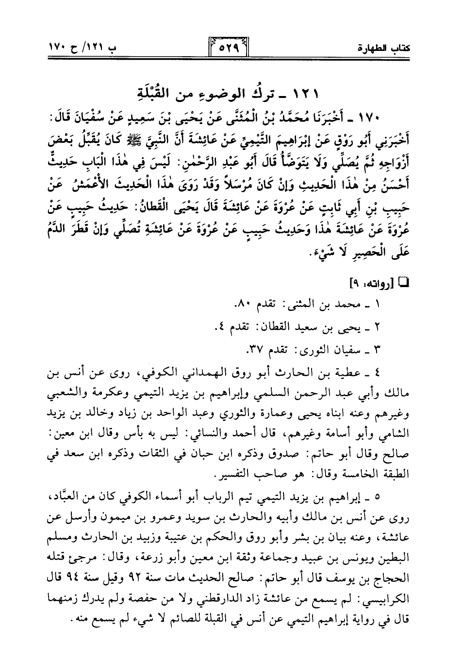 5 - إبراهيم بن يزيد التيمي تيم الرباب أبو أسماء الكوفي كان من العباد، روى عن أنس بن مالك وأبيه والحارث بن سويد وعمرو بن ميمون وأرسل عن عائشة، وعنه بيان بن بشر وأبو روق والحكم بن عتيبة وزبيد بن الحارث ومسلم البطين ويونس بن عبيد وجماعة وثقه ابن معين وأبو زرعة، وقال: مرجئ قتله الحجاج بن يوسف قال أبو حاتم: صالح الحديث مات سنة 92 وقيل سنة 94 قال الكرابيسي: لم يسمع من عائشة زاد الدارقطني ولا من حفصة ولم يدرك زمنهما قال في رواية إبراهيم التيمي عن أنس في القبلة للصائم لا شيء لم يسمع منه.