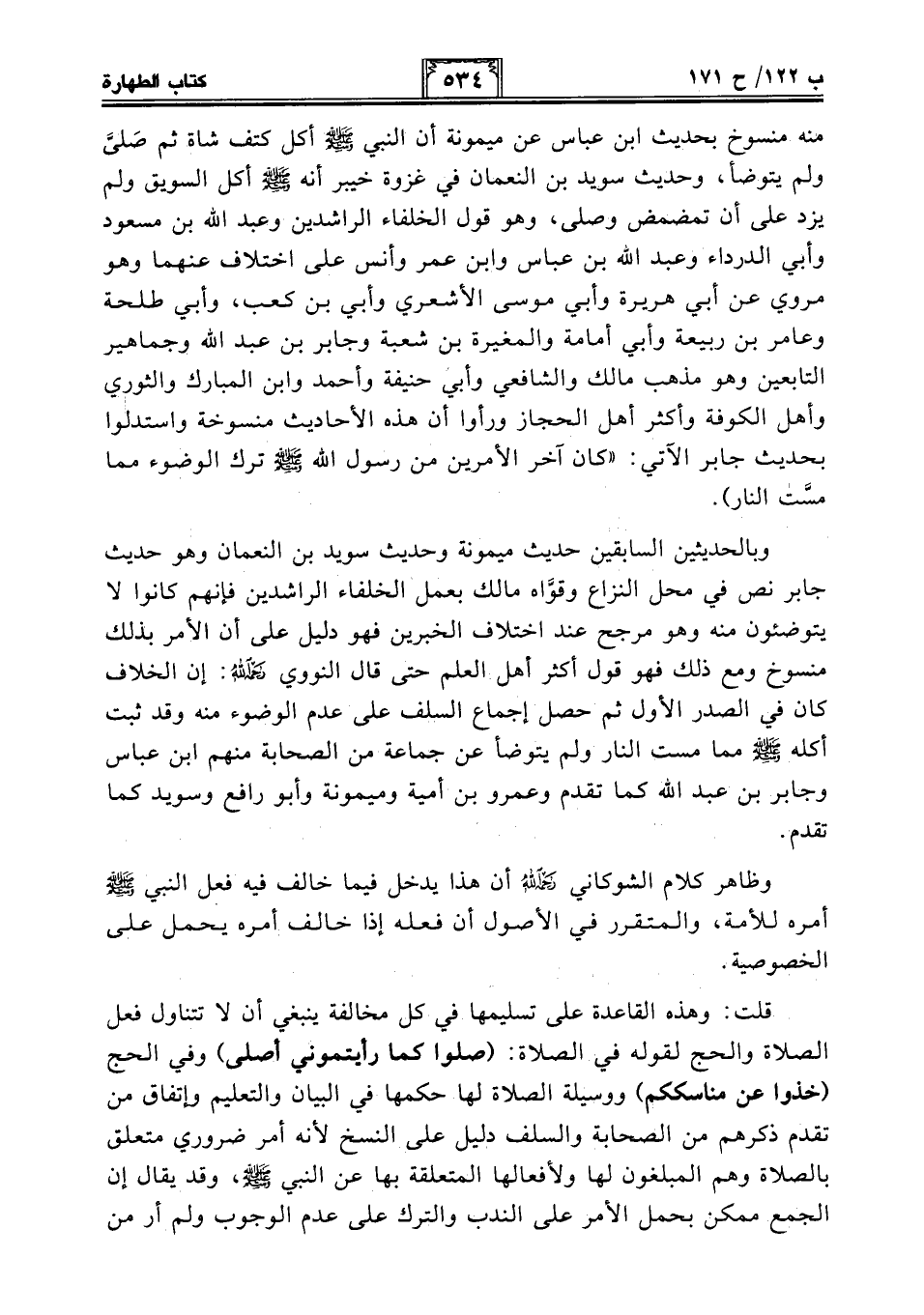 وبالحديثين السابقين حديث ميمونة وحديث سويد بن النعمان وهو حديث جابر نص في محل النزاع وقوَّاه مالك بعمل الخلفاء الراشدين فإنهم كانوا لا يتوضئون منه وهو مرجح عند اختلاف الخبرين فهو دليل على أن الأمر بذلك منسوخ ومع ذلك فهو قول أكثر أهل العلم حتى قال النووي -رحمه الله-: إن الخلاف كان في الصدر الأول ثم حصل إجماع السلف على عدم الوضوء منه وقد ثبت أكله - صلى الله عليه وسلم - مما مست النار ولم يتوضأ عن جماعة من الصحابة منهم ابن عباس وجابر بن عبد الله كما تقدم وعمرو بن أمية وميمونة وأبو رافع وسويد كما تقدم.