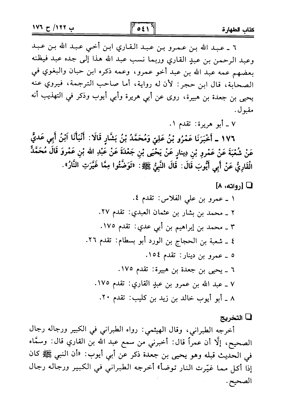176 - أَخْبَرَنَا عَمْرُو بْنُ عَلِيٍّ وَمُحَمَّدُ بْنُ بَشَّارٍ قَالَا: أَنْبَأَنَا ابْنُ أَبِي عَدِيٍّ عَنْ شُعْبَةَ عَنْ عَمْرِو بْنِ دِينَارٍ عَنْ يَحْيَى بْنِ جَعْدَةَ عَنْ عَبْدِ اللَّهِ بْنِ عَمْرٍو قَالَ مُحَمَّدٌ الْقَارِيُّ عَنْ أَبِي أَيُّوبَ قَالَ: قَالَ النَّبِيُّ - صلى الله عليه وسلم -: "تَوَضَّئُوا مِمَّا غَيَّرَتِ النَّارُ".