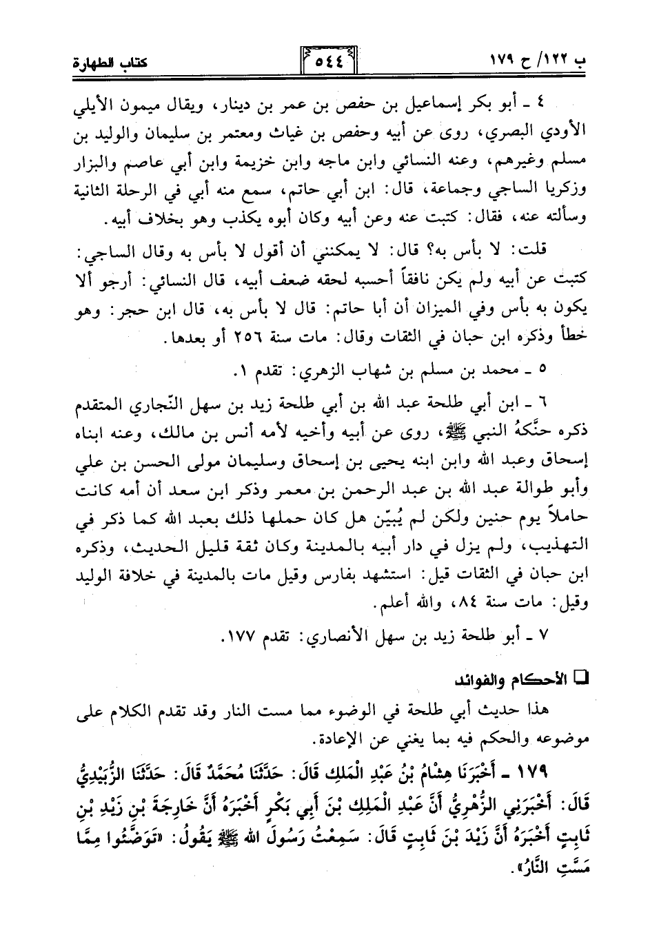 179 - أَخْبَرَنَا هِشَامُ بْنُ عَبْدِ الْمَلِكِ قَالَ: حَدَّثَنَا مُحَمَّدٌ قَالَ: حَدَّثَنَا الزُّبَيْدِيُّ قَالَ: أَخْبَرَنِي الزُّهْرِيُّ أَنَّ عَبْدَ الْمَلِكِ بْنَ أَبِي بَكْرٍ أَخْبَرَهُ أَنَّ خَارِجَةَ بْنَ زَيْدِ بْنِ ثَابِتٍ أَخْبَرَهُ أَنَّ زَيْدَ بْنَ ثَابِتٍ قَالَ: سَمِعْتُ رَسُولَ اللَّهِ - صلى الله عليه وسلم - يَقُولُ: "تَوَضَّئُوا مِمَّا مَسَّتِ النَّارُ".