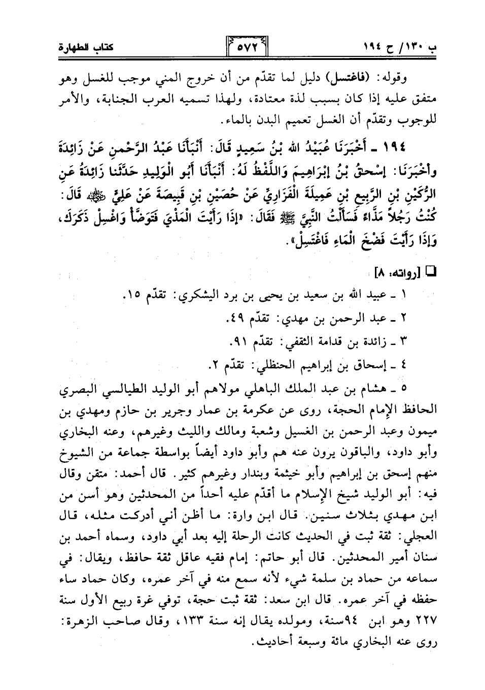 194 - أَخْبَرَنَا عُبَيْدُ اللَّهِ بْنُ سَعِيدٍ قَالَ: أَنْبَأَنَا عَبْدُ الرَّحْمَنِ عَنْ زَائِدَةَ وَأَخْبَرَنَا: إِسْحَاقُ بْنُ إِبْرَاهِيمَ وَاللَّفْظُ لَهُ: أَنْبَأَنَا أَبُو الْوَلِيدِ حَدَّثَنَا زَائِدَةُ عَنِ الرُّكَيْنِ بْنِ الرَّبِيعِ بْنِ عَمِيلَةَ الْفَزَارِيِّ عَنْ حُصَيْنِ بْنِ قَبِيصَةَ عَنْ عَلِيٍّ - رضى الله عنه - قَالَ: كُنْتُ رَجُلًا مَذَّاءً فَسَأَلْتُ النَّبِيَّ - صلى الله عليه وسلم - فَقَالَ: "إِذَا رَأَيْتَ الْمَذْيَ فَتَوَضَّأْ وَاغْسِلْ ذَكَرَكَ، وَإِذَا رَأَيْتَ فَضْخَ الْمَاءِ فَاغْتَسِلْ".