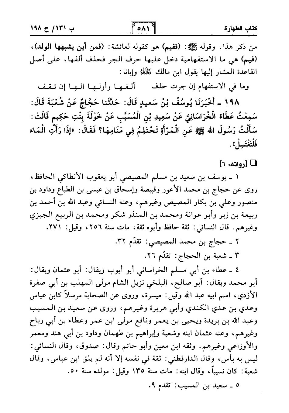 198 - أَخْبَرَنَا يُوسُفُ بْنُ سَعِيدٍ قَالَ: حَدَّثَنَا حَجَّاجٌ عَنْ شُعْبَةَ قَالَ: سَمِعْتُ عَطَاءً الْخُرَاسَانِيَّ عَنْ سَعِيدِ بْنِ الْمُسَيَّبِ عَنْ خَوْلَةَ بِنْتِ حَكِيمٍ قَالَتْ: سَأَلْتُ رَسُولَ اللَّهِ - صلى الله عليه وسلم - عَنِ الْمَرْأَةِ تَحْتَلِمُ فِي مَنَامِهَا؟ فَقَالَ: "إِذَا رَأَتِ الْمَاءَ فَلْتَغْتَسِلْ".
