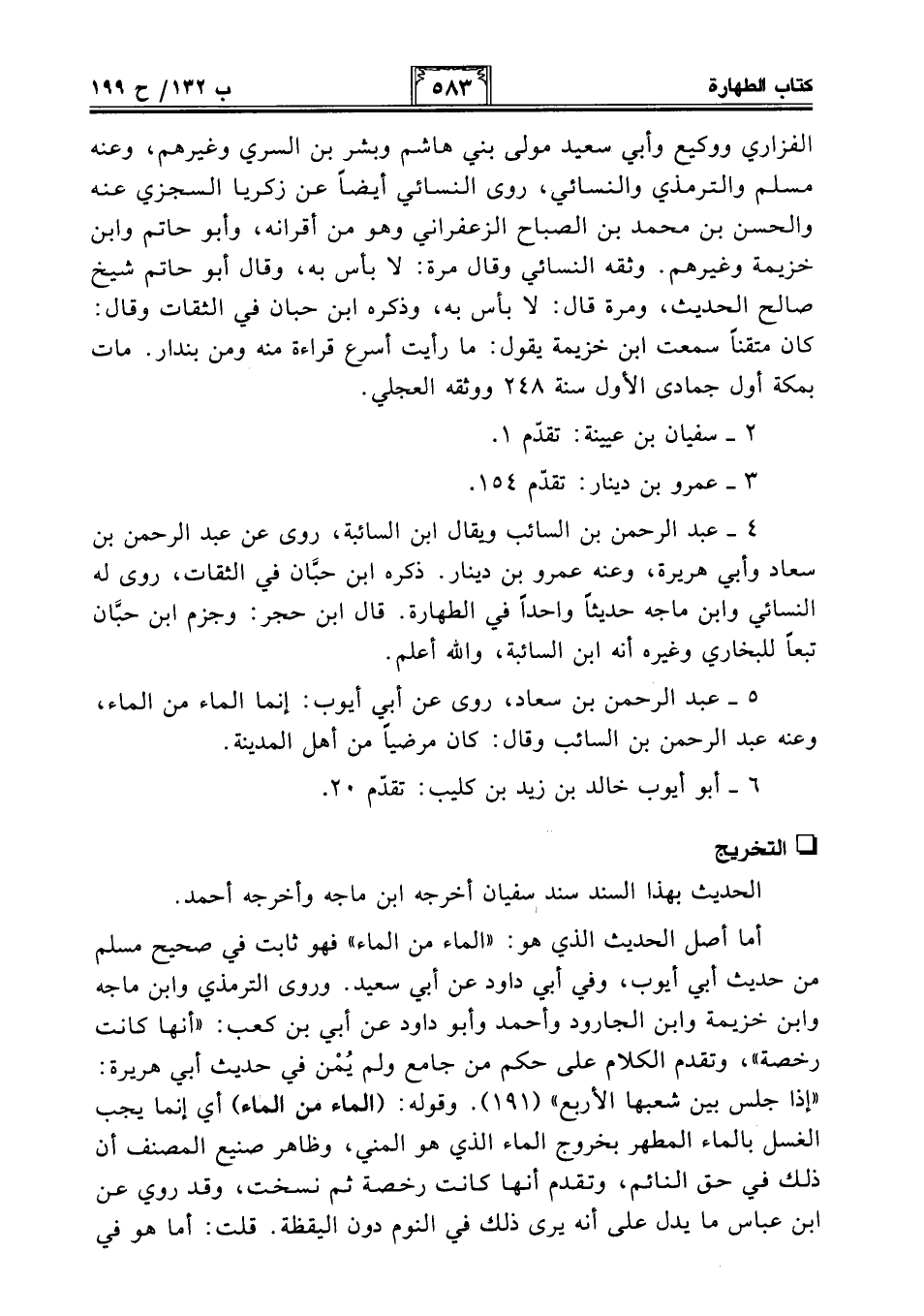 أما أصل الحديث الذي هو: "الماء من الماء" فهو ثابت في صحيح مسلم من حديث أبي أيوب، وفي أبي داود عن أبي سعيد. وروى الترمذي وابن ماجه وابن خزيمة وابن الجارود وأحمد وأبو داود عن أبي بن كعب: "أنها كانت رخصة"، وتقدم الكلام على حكم من جامع ولم يُمْن في حديث أبي هريرة: "إذا جلس بين شعبها الأربع" (191). وقوله: (الماء من الماء) أي إنما يجب الغسل بالماء المطهر بخروج الماء الذي هو المني، وظاهر صنيع المصنف أن ذلك في حق النائم، وتقدم أنها كانت رخصة ثم نسخت، وقد روي عن ابن عباس ما يدل على أنه يرى ذلك في النوم دون اليقظة. قلت: أما هو في