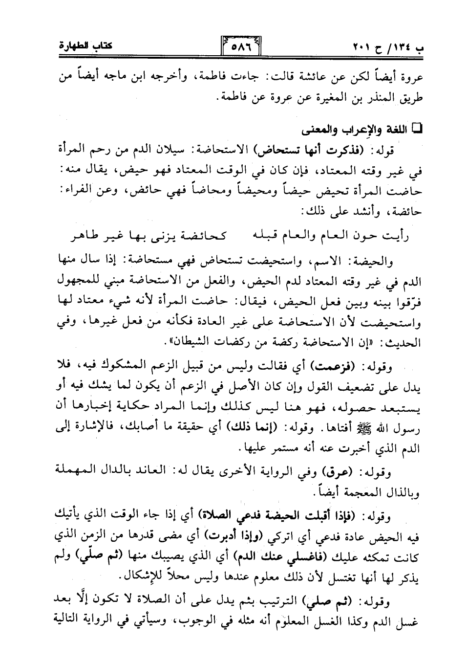 قوله: (فذكرت أنها تستحاض) الإستحاضة: سيلان الدم من رحم المرأة في غير وقته المعتاد، فإن كان في الوقت المعتاد فهو حيض، يقال منه: حاضت المرأة تحيض حيضًا ومحيضًا ومحاضًا فهي حائض، وعن الفراء: حائضة، وأنشد على ذلك: