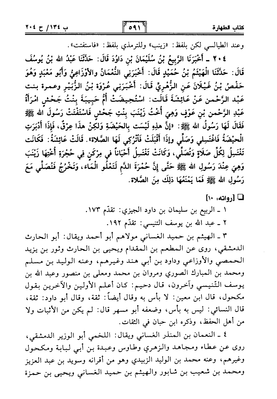 204 - أَخْبَرَنَا الرَّبِيعُ بْنُ سُلَيْمَانَ بْنِ دَاوُدَ قَالَ: حَدَّثَنَا عَبْدُ اللَّهِ بْنُ يُوسُفَ قَالَ: حَدَّثَنَا الْهَيْثَمُ بْنُ حُمَيْدٍ قَالَ: أَخْبَرَنِي النُّعْمَانُ وَالأَوْزَاعِيُّ وَأَبُو معبدٍ وَهُوَ حَفْصُ بْنُ غَيْلَانَ عَنِ الزُّهْرِيِّ قَالَ: أَخْبَرَنِي عُرْوَةُ بْنُ الزُّبَيْرِ وَعَمْرَةُ بِنْتُ عَبْدِ الرَّحْمَنِ عَنْ عَائِشَةَ قَالَتِ: اسْتُحِيضَتْ أُمُّ حَبِيبَةَ بِنْتُ جَحْشٍ امْرَأَةُ عَبْدِ الرَّحْمَنِ بْنِ عَوْفٍ وَهِيَ أُخْتُ زَيْنَبَ بِنْتِ جَحْشٍ فَاسْتَفْتَتْ رَسُولَ اللَّهِ - صلى الله عليه وسلم - فَقَالَ لَهَا رَسُولُ اللَّهِ - صلى الله عليه وسلم -: "إِنَّ هَذِهِ لَيْسَتْ بِالْحَيْضَةِ وَلَكِنْ هَذَا عِرْقٌ، فَإِذَا أَدْبَرَتِ الْحَيْضَةُ فَاغْتَسِلِي وَصَلِّي وَإِذَا أَقْبَلَتْ فَاتْرُكِي لَهَا الصَّلَاةَ". قَالَتْ عَائِشَةُ: فَكَانَتْ تَغْتَسِلُ لِكُلِّ صَلَاةٍ وَتُصَلِّي، وَكَانَتْ تَغْتَسِلُ أَحْيَانًا فِي مِرْكَنٍ فِي حُجْرَةِ أُخْتِهَا زَيْنَبَ وَهِيَ عِنْدَ رَسُولِ اللَّهِ - صلى الله عليه وسلم - حَتَّى إِنَّ حُمْرَةَ الدَّمِ لَتَعْلُو الْمَاءَ، وَتَخْرُجُ فَتُصَلِّي مَعَ رَسُولِ اللَّهِ - صلى الله عليه وسلم - فَمَا يَمْنَعُهَا ذَلِكَ مِنَ الصَّلَاةِ.