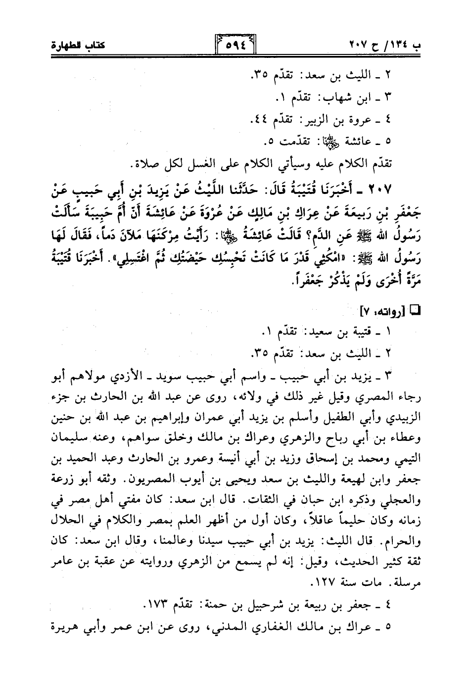 207 - أَخْبَرَنَا قُتَيْبَةُ قَالَ: حَدَّثَنَا اللَّيْثُ عَنْ يَزِيدَ بْنِ أَبِي حَبِيبٍ عَنْ جَعْفَرِ بْنِ رَبِيعَةَ عَنْ عِرَاكِ بْنِ مَالِكٍ عَنْ عُرْوَةَ عَنْ عَائِشَةَ أَنَّ أُمَّ حَبِيبَةَ سَأَلَتْ رَسُولَ اللَّهِ - صلى الله عليه وسلم - عَنِ الدَّمِ؟ قَالَتْ عَائِشَةُ -رضي الله عنها-: رَأَيْتُ مِرْكَنَهَا مَلآنَ دَمًا، فَقَالَ لَهَا رَسُولُ اللَّهِ - صلى الله عليه وسلم -: "امْكُثِي قَدْرَ مَا كَانَتْ تَحْبِسُكِ حَيْضَتُكِ ثُمَّ اغْتَسِلِي". أَخْبَرَنَا قُتَيْبَةُ مَرَّةً أُخْرَى وَلَمْ يَذْكُرْ جَعْفَرًا.