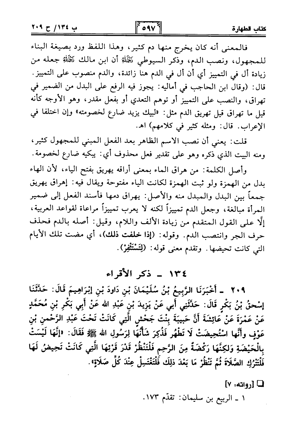 فالمعنى أنه كان يخرج منها دم كثير، وهذا اللفظ ورد بصيغة البناء للمجهول، ونصب الدم، وذكر السيوطي -رحمه الله- أن ابن مالك -رحمه الله- جعله من زيادة أل في التمييز أي أن أل في الدم هنا زائدة، والدم منصوب على التمييز. قال: (وقال ابن الحاجب في أماليه: يجوز فيه الرفع على البدل من الضمير في تهراق، والنصب على التمييز أو توهم التعدي أو بفعل مقدر، وهو الأوجه كأنه قيل ما تهراق قيل تهريق الدم مثل: "لبيك يزيد ضارع لخصومته" وإن اختلفا في الإعراب. قال: ومثله كثير في كلامهم) اهـ.