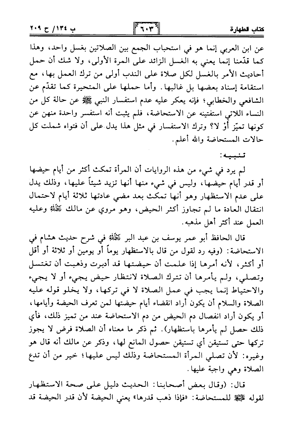قال الحافظ أبو عمر يوسف بن عبد البر -رحمه الله- في شرح حديث هشام في الاستحاضة: (وفيه رد لقول من قال بالاستظهار يومًا أو يومين أو ثلاثة أو أقل أو أكثر، لأنه أمرها إذا علمت أن حيضتها قد أدبرت وذهبت أن تغتسل وتصلي، ولم يأمرها أن تترك الصلاة لانتظار حيض يجيء أو لا يجيء والاحتياط إنما يجب في عمل الصلاة لا في تركها, ولا يخلو قوله عليه الصلاة والسلام أن يكون أراد إنقضاء أيام حيضتها لمن تعرف الحيضة وأيامها، أو يكون أراد إنفصال دم الحيض من دم الاستحاضة عند من يتميز ذلك، فأي ذلك حصل لم يأمرها باستظهار). ثم ذكر ما معناه أن الصلاة فرض لا يجوز تركها حتى تستيقن أي تستيقن حصول المانع لها، وذكر عن مالك أنه قال هو وغيره: لأن تصلي المرأة المستحاضة وذلك ليس عليها؛ خير من أن تدع الصلاة وهي واجبة عليها.
