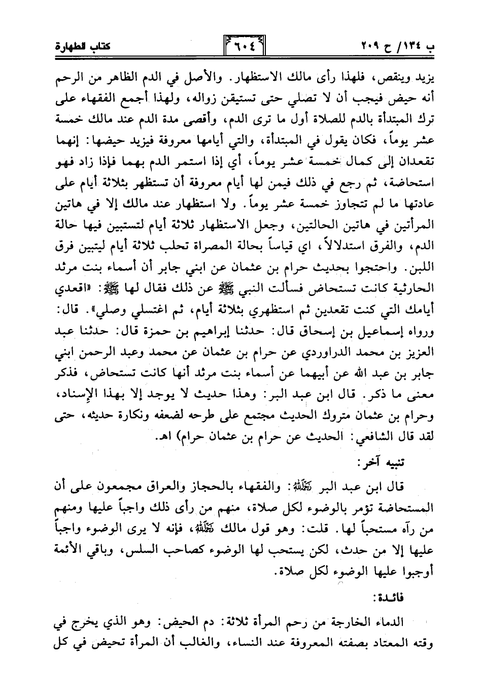 يزيد وينقص، فلهذا رأى مالك الاستظهار. والأصل في الدم الظاهر من الرحم أنه حيض فيجب أن لا تصلي حتى تستيقن زواله، ولهذا أجمع الفقهاء على ترك المبتدأة بالدم للصلاة أول ما ترى الدم، وأقصى مدة الدم عند مالك خمسة عشر يومًا، فكان يقول في المبتدأة، والتي أيامها معروفة فيزيد حيضها: إنهما تقعدان إلى كمال خمسة عشر يومًا، أي إذا استمر الدم بهما فإذا زاد فهو استحاضة، ثم رجع في ذلك فيمن لها أيام معروفة أن تستظهر بثلاثة أيام على عادتها ما لم تتجاوز خمسة عشر يومًا. ولا استظهار عند مالك إلا في هاتين المرأتين في هاتين الحالتين، وجعل الاستظهار ثلاثة أيام لتستبين فيها حالة الدم، والفرق استدلالًا، أي قياسًا بحالة المصراة تحلب ثلاثة أيام ليتبين فرق اللبن. واحتجوا بحديث حرام بن عثمان عن ابني جابر أن أسماء بنت مرثد الحارثية كانت تستحاض فسألت النبي - صلى الله عليه وسلم - عن ذلك فقال لها - صلى الله عليه وسلم -: "اقعدي أيامك التي كنت تقعدين ثم استظهري بثلاثة أيام، ثم اغتسلي وصلي". قال: ورواه إسماعيل بن إسحاق قال: حدثنا إبراهيم بن حمزة قال: حدثنا عبد العزيز بن محمد الدراوردي عن حرام بن عثمان عن محمد وعبد الرحمن ابني جابر بن عبد الله عن أبيهما عن أسماء بنت مرثد أنها كانت تستحاض، فذكر معنى ما ذكر. قال ابن عبد البر: وهذا حديث لا يوجد إلا بهذا الإِسناد، وحرام بن عثمان متروك الحديث مجتمع على طرحه لضعفه ونكارة حديثه، حتى لقد قال الشافعي: الحديث عن حرام بن عثمان حرام) اهـ.