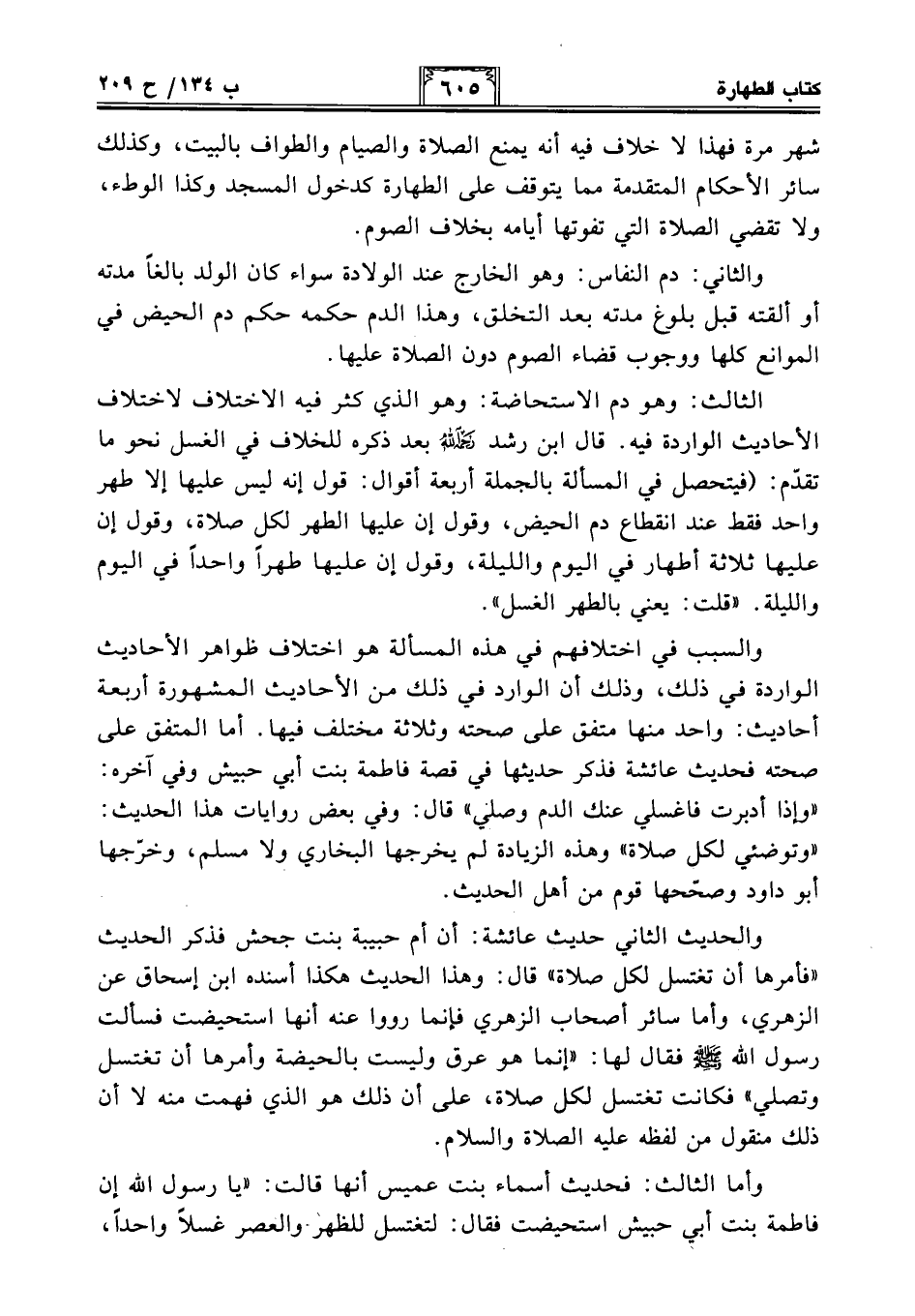 الثالث: وهو دم الاستحاضة: وهو الذي كثر فيه الاختلاف لاختلاف الأحاديث الواردة فيه. قال ابن رشد -رحمه الله- بعد ذكره للخلاف في الغسل نحو ما تقدّم: (فيتحصل في المسألة بالجملة أربعة أقوال: قول إنه ليس عليها إلا طهر واحد فقط عند إنقطاع دم الحيض، وقول إن عليها الطهر لكل صلاة، وقول إن عليها ثلاثة أطهار في اليوم والليلة، وقول إن عليها طهرا واحدًا في اليوم والليلة. "قلت: يعني بالطهر الغسل".