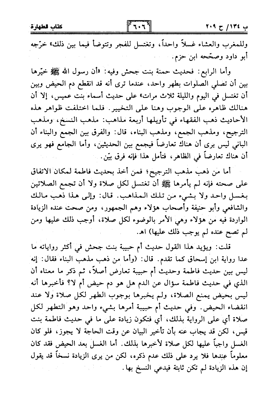 وأما الرابع: فحديث حمنة بنت جحش وفيه: "أن رسول الله - صلى الله عليه وسلم - خيّرها بين أن تصلي الصلوات بطهر واحد، عندما ترى أنه قد إنقطع دم الحيض وبين أن تغتسل في اليوم والليلة ثلاث مرات" على حديث أسماء بنت عميس، إلا أن هنالك ظاهره على الوجوب وهنا على التخيير. فلما اختلفت ظواهر هذه الأحاديث ذهب الفقهاء في تأويلها أربعة مذاهب: مذهب النسخ، ومذهب الترجيح، ومذهب الجمع، ومذهب البناء، قال: والفرق بين الجمع والبناء أن الباني ليس يرى أن هناك تعارضًا فيجمع بين الحديثين، وأما الجامع فهو يرى أن هناك تعارضًا في الظاهر، فتأمل هذا فإنه فرق بيّن.