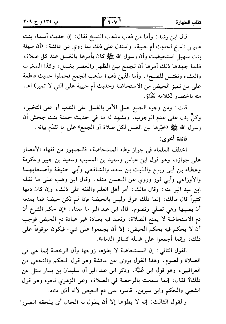 قال ابن رشد: وأما من ذهب مذهب النسخ فقال: إن حديث أسماء بنت عميس ناسخ لحديث أم حبيبة، واستدل على ذلك بما روي عن عائشة: "أن سهلة بنت سهيل استحيضت وأن رسول الله - صلى الله عليه وسلم - كان يأمرها بالغسل عند كل صلاة، فلها جهدها ذلك أمرها أن تجمع بين الظهر والعصر بغسل، وكذا المغرب والعشاء وتغتسل للصبح". وأما الذين ذهبوا مذهب الجمع فحملوا حديث فاطمة على من تميز الحيض من الاستحاضة وحديث أم حبيبة على التي لا تميز) اهـ. منه باختصار لكلامه -رحمه الله-.