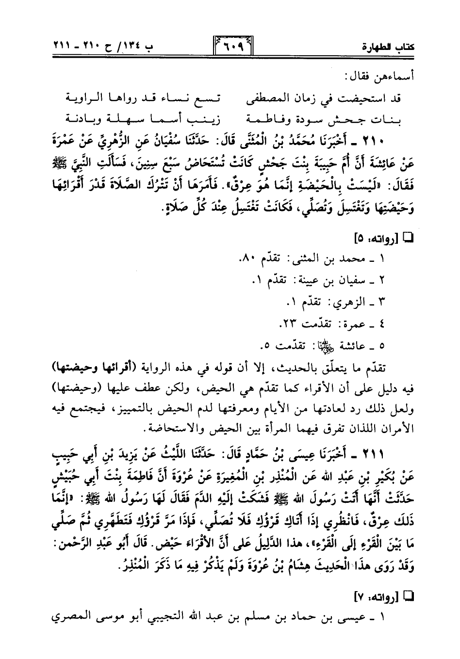 210 - أَخْبَرَنَا مُحَمَّدُ بْنُ الْمُثَنَّى قَالَ: حَدَّثَنَا سُفْيَانُ عَنِ الزُّهْرِيِّ عَنْ عَمْرَةَ عَنْ عَائِشَةَ أَنَّ أُمَّ حَبِيبَةَ بِنْتَ جَحْشٍ كَانَتْ تُسْتَحَاضُ سَبْعَ سِنِينَ، فَسَأَلَتِ النَّبِيَّ - صلى الله عليه وسلم - فَقَالَ: "لَيْسَتْ بِالْحَيْضَةِ إِنَّمَا هُوَ عِرْقٌ". فَأَمَرَهَا أَنْ تَتْرُكَ الصَّلَاةَ قَدْرَ أَقْرَائِهَا وَحَيْضَتِهَا وَتَغْتَسِلَ وَتُصَلِّي، فَكَانَتْ تَغْتَسِلُ عِنْدَ كُلِّ صَلَاةٍ.