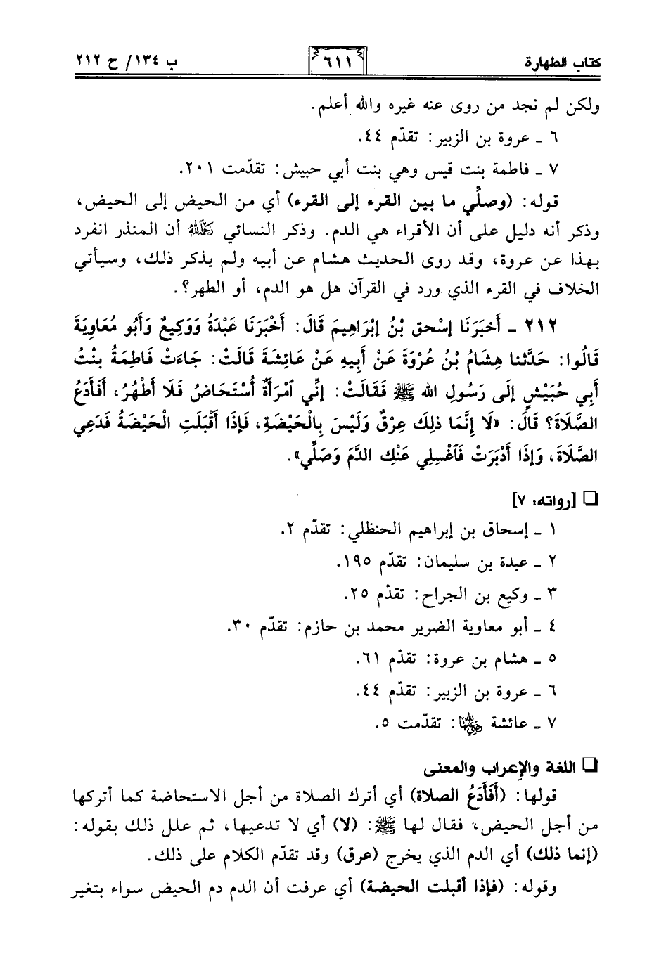 212 - أَخْبَرَنَا إِسْحَاقُ بْنُ إِبْرَاهِيمَ قَالَ: أَخْبَرَنَا عَبْدَةُ وَوَكِيعٌ وَأَبُو مُعَاوِيَةَ قَالُوا: حَدَّثَنَا هِشَامُ بْنُ عُرْوَةَ عَنْ أَبِيهِ عَنْ عَائِشَةَ قَالَتْ: جَاءَتْ فَاطِمَةُ بِنْتُ أَبِي حُبَيْشٍ إِلَى رَسُولِ اللَّهِ - صلى الله عليه وسلم - فَقَالَتْ: إِنِّي امْرَأَةٌ أُسْتَحَاضُ فَلَا أَطْهُرُ، أَفَأَدَعُ الصَّلَاةَ؟ قَالَ: "لَا إِنَّمَا ذَلِكِ عِرْقٌ وَلَيْسَ بِالْحَيْضَةِ، فَإِذَا أَقْبَلَتِ الْحَيْضَةُ فَدَعِي الصَّلَاةَ، وَإِذَا أَدْبَرَتْ فَاغْسِلِي عَنْكِ الدَّمَ وَصَلِّي".