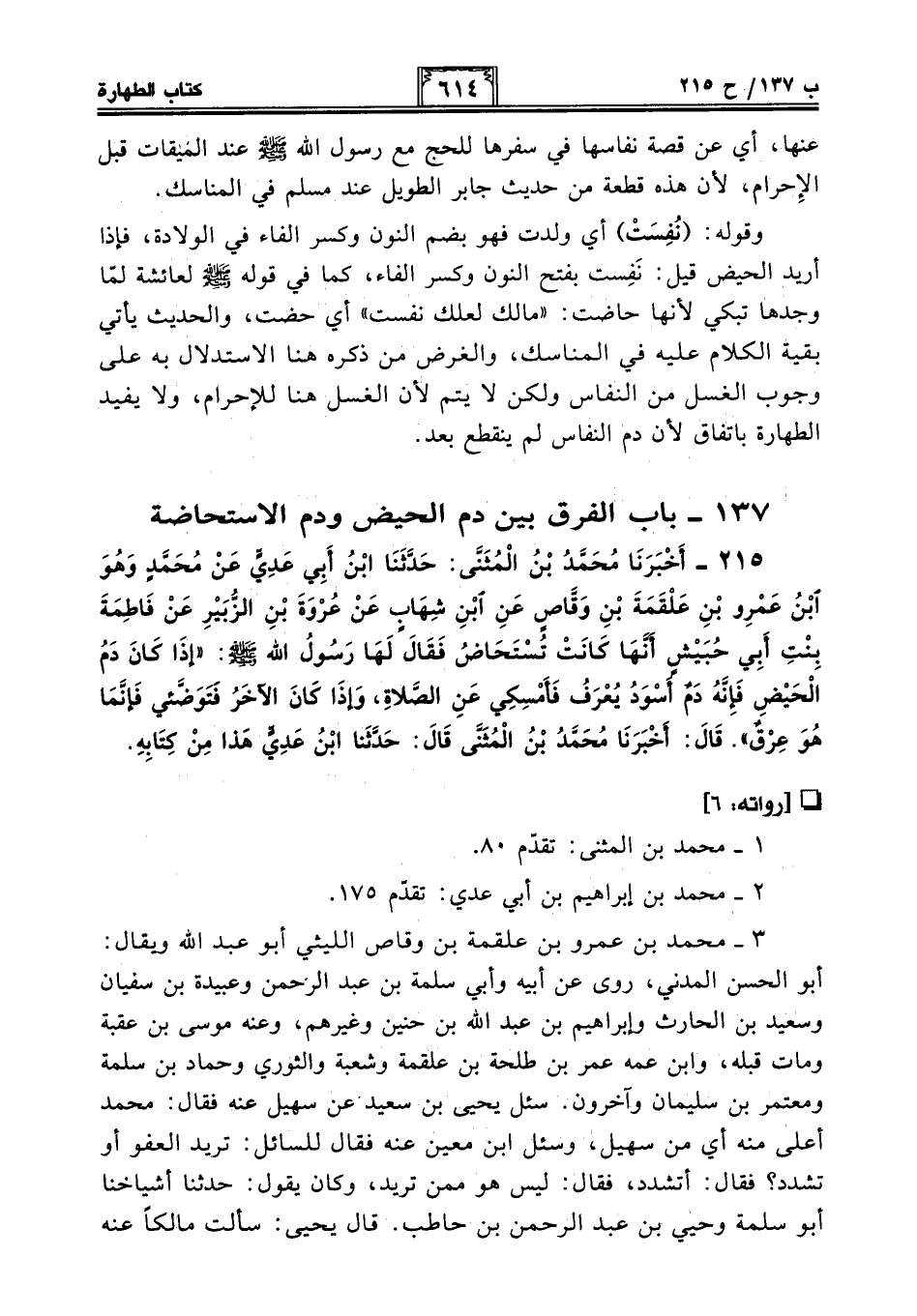 عنها، أي عن قصة نفاسها في سفرها للحج مع رسول الله - صلى الله عليه وسلم - عند الميقات قبل الإِحرام, لأن هذه قطعة من حديث جابر الطويل عند مسلم في المناسك.