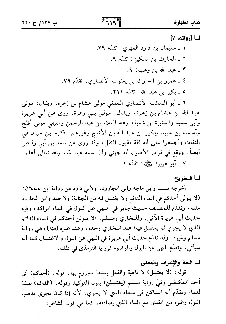 أخرجه مسلم وابن ماجه وابن الجارود، ولأبي داود من رواية ابن عجلان: (لا يبولن أحدكم في الماء الدائم ولا يغتسل فيه من الجنابة) ولأحمد وابن الجارود مثله، وتقدم للمصنف حديث جابر في النهي عن البول في الماء الراكد، وفيه حديث أبي هريرة الآتي. وللبخاري ومسلم: "لا يبولن أحدكم في الماء الدائم الذي لا يجري ثم يغتسل فيه" عند البخاري وحده، وعند غيره (منه) وهي رواية مسلم وغيره. وقد تقدّم حديث أبي هريرة في النهي عن البول والاغتسال كما أنه سيأتي، وتقدّم النهي عن البول والوضوء كرواية الترمذي في ذلك.