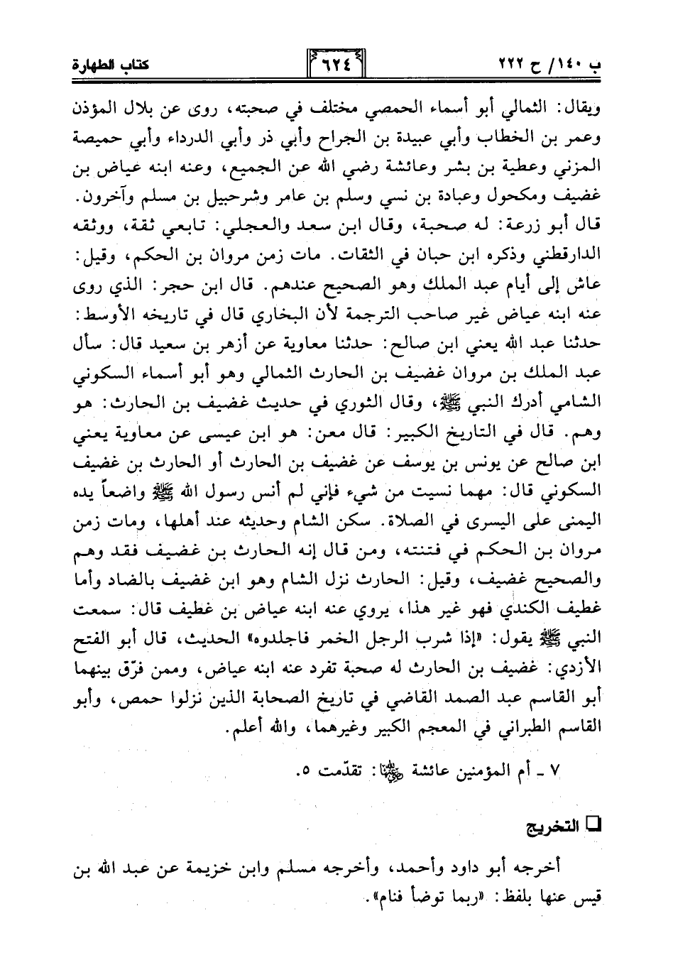 أخرجه أبو داود وأحمد، وأخرجه مسلم وابن خزيمة عن عبد الله بن قيس عنها بلفظ: "ربما توضأ فنام".