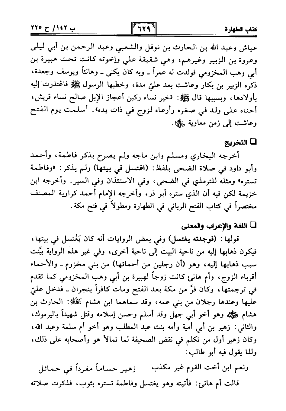قولها: (فوجدته يغتسل) وفي بعض الروايات أنه كان يَغتسل في بيتها، فيكون ذهابها إليه من ناحية البيت إلى ناحية أخرى، وفي غير هذه الرواية بينت سبب ذهابها إليه، وهو (أن رجلين من أحمائها) من بني مخزوم -والأحماء أقرباء الزوج، وأم هانئ كانت زوجًا لهبيرة بن أبي وهب المخزومي كما تقدم في ترجمتها، وكان فر من مكة بعد الفتح ومات كافرًا بنجران- فدخل عليّ عليها وعندها رجلان من بني عمه، وقد سماهما ابن هشام -رحمه الله-: الحارث بن هشام - رضي الله عنه - وهو أخو أبي جهل وقد أسلم وحسن إسلامه وقتل شهيدًا باليرموك، والثاني: زهير بن أبي أمية وأمه بنت عبد المطلب وهو أخو أم سلمة وعبد الله، وكان زهير أول من تكلم في نقض الصحيفة لما تمالأ هو وأصحابه على ذلك، ولذا يقول فيه أبو طالب: