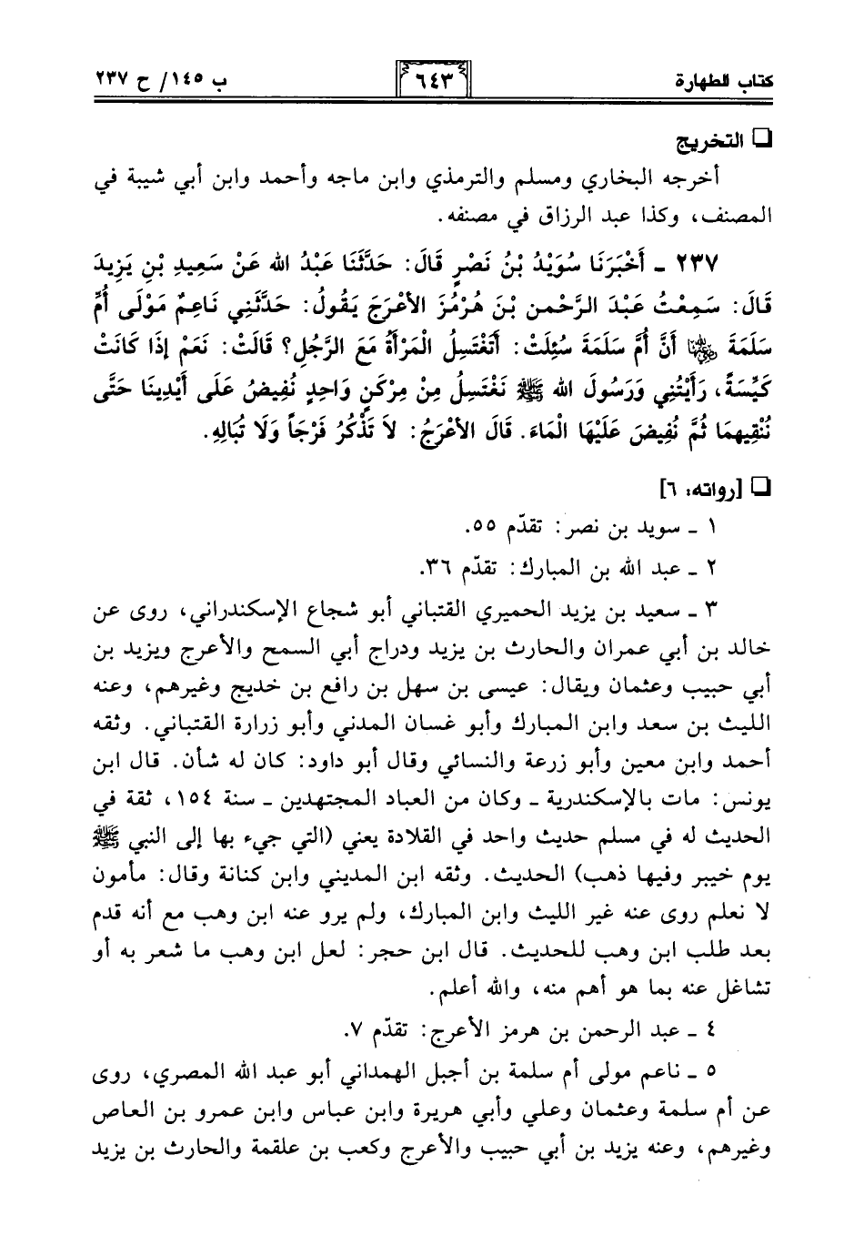 237 - أَخْبَرَنَا سُوَيْدُ بْنُ نَصْرٍ قَالَ: حَدَّثَنَا عَبْدُ اللَّهِ عَنْ سَعِيدِ بْنِ يَزِيدَ قَالَ: سَمِعْتُ عَبْدَ الرَّحْمَنِ بْنَ هُرْمُزَ الأَعْرَجَ يَقُولُ: حَدَّثَنِي نَاعِمٌ مَوْلَى أُمِّ سَلَمَةَ -رضي الله عنها- أَنَّ أُمَّ سَلَمَةَ سُئِلَتْ: أَتَغْتَسِلُ الْمَرْأَةُ مَعَ الرَّجُلِ؟ قَالَتْ: نَعَمْ إِذَا كَانَتْ كَيِّسَةً، رَأَيْتُنِي وَرَسُولَ اللَّهِ - صلى الله عليه وسلم - نَغْتَسِلُ مِنْ مِرْكَنٍ وَاحِدٍ نُفِيضُ عَلَى أَيْدِينَا حَتَّى نُنْقِيَهمَا ثُمَّ نُفِيضَ عَلَيْهَا الْمَاءَ. قَالَ الأَعْرَجُ: لَا تَذْكُرُ فَرْجًا وَلَا تُبَالِهِ.