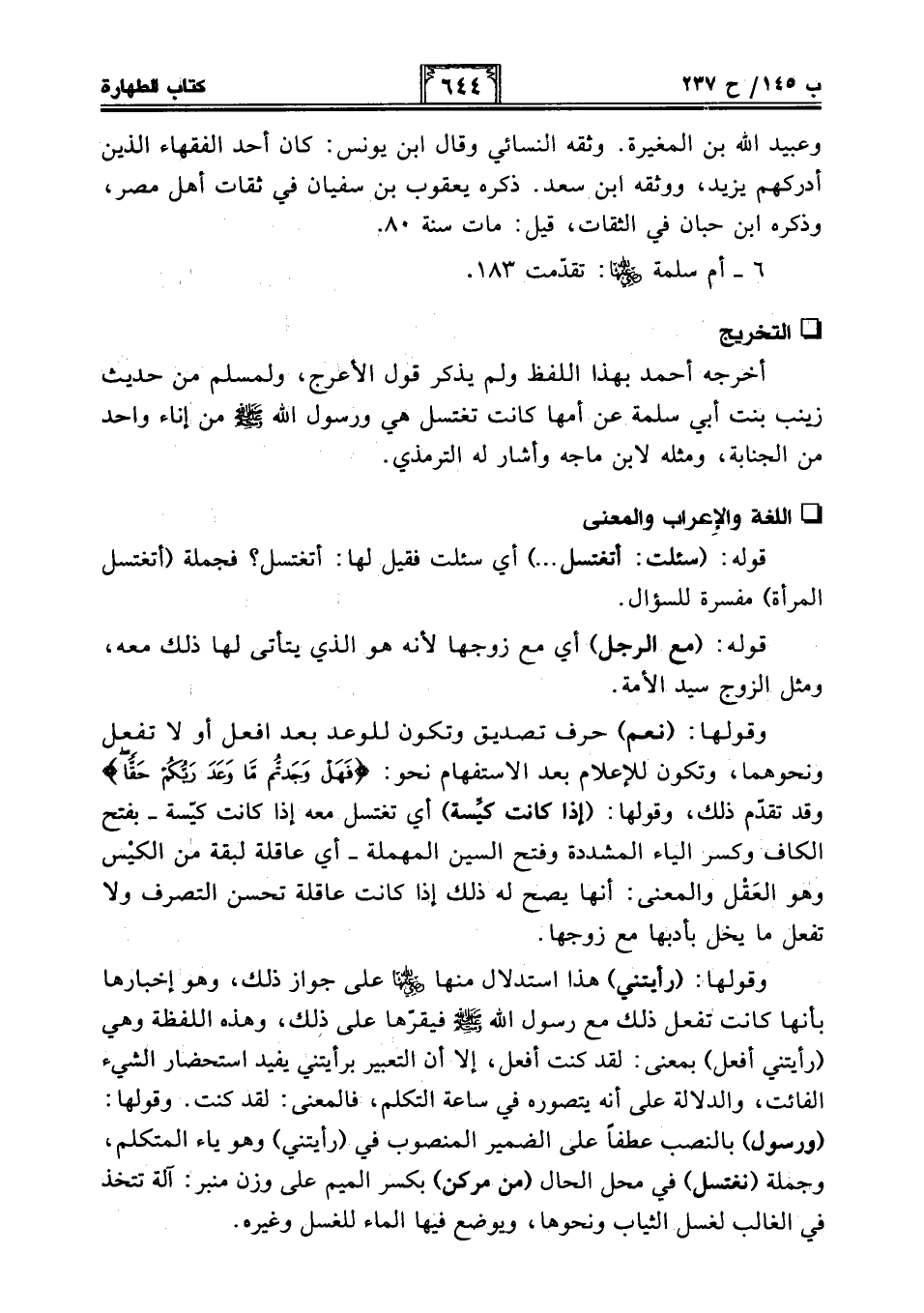 وقولها: (نعم) حرف تصديق وتكون للوعد بعد افعل أو لا تفعل ونحوهما، وتكون للإعلام بعد الاستفهام نحو: {فَهَلْ وَجَدْتُمْ مَا وَعَدَ رَبُّكُمْ حَقًّا} وقد تقدّم ذلك، وقولها: (إذا كانت كيسة) أي تغتسل معه إذا كانت كيّسة -بفتح الكاف وكسر الياء المشددة وفتح السين المهملة- أي عاقلة لبقة من الكيْس وهو العَقْل والمعنى: أنها يصح له ذلك إذا كانت عاقلة تحسن التصرف ولا تفعل ما يخل بأدبها مع زوجها.