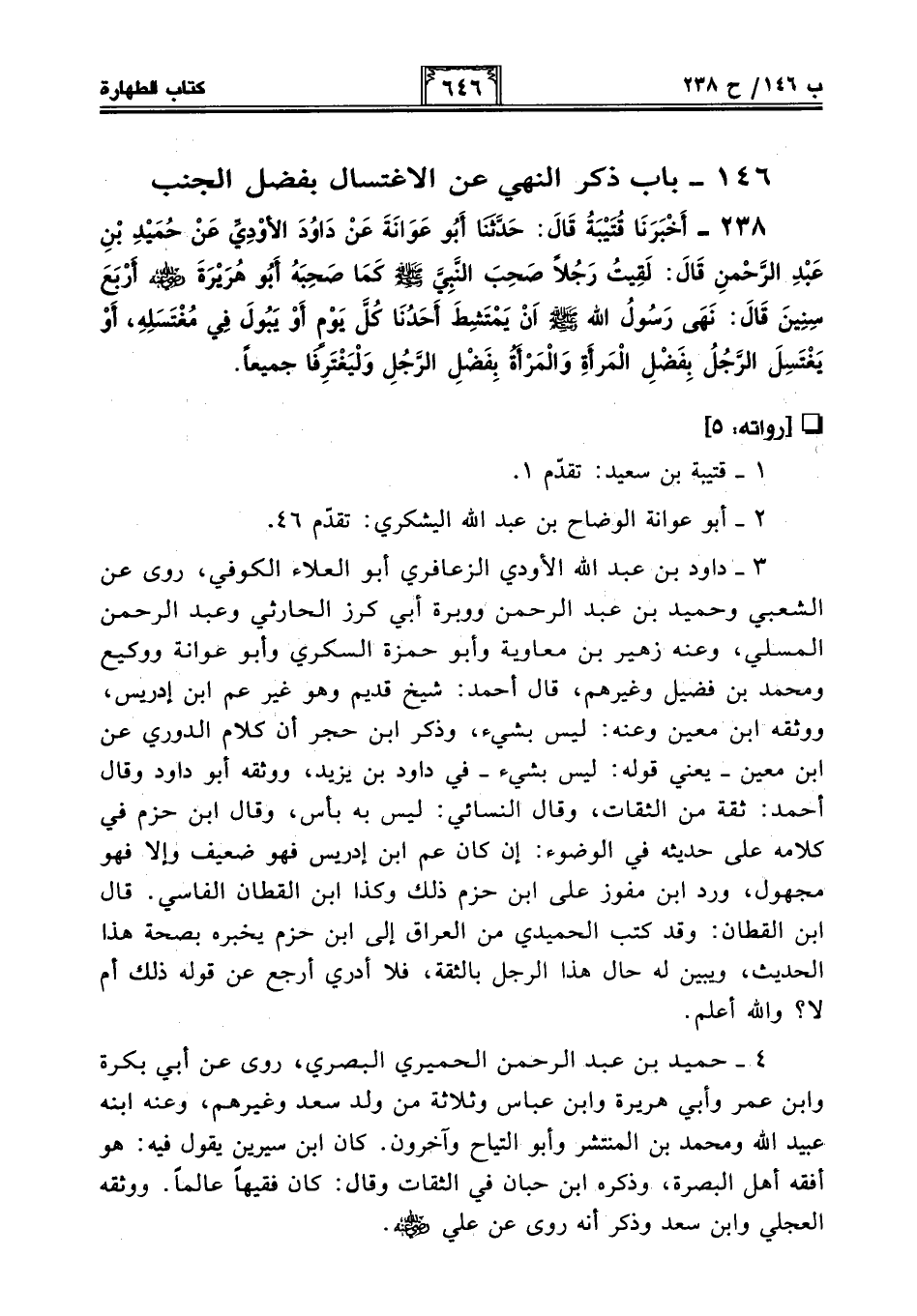 238 - أَخْبَرَنَا قُتَيْبَةُ قَالَ: حَدَّثَنَا أَبُو عَوَانَةَ عَنْ دَاوُدَ الأَوْدِيِّ عَنْ حُمَيْدِ بْنِ عَبْدِ الرَّحْمَنِ قَالَ: لَقِيتُ رَجُلًا صَحِبَ النَّبِيَّ - صلى الله عليه وسلم - كَمَا صَحِبَهُ أَبُو هُرَيْرَةَ - رضي الله عنه - أَرْبَعَ سِنِينَ قَالَ: نَهَى رَسُولُ اللَّهِ - صلى الله عليه وسلم - أَنْ يَمْتَشِطَ أَحَدُنَا كُلَّ يَوْمٍ أَوْ يَبُولَ فِي مُغْتَسَلِهِ، أَوْ يَغْتَسِلَ الرَّجُلُ بِفَضْلِ الْمَرْأَةِ وَالْمَرْأَةُ بِفَضْلِ الرَّجُلِ وَلْيَغْتَرِفَا جَمِيعًا.