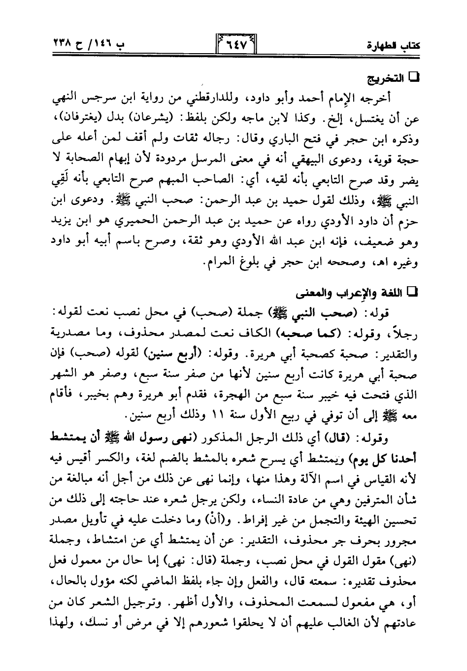 وقوله: (قال) أي ذلك الرجل المذكور (نهى رسول الله - صلى الله عليه وسلم - أن يمتشط أحدنا كل يوم) ويمتشط أي يسرح شعره بالمشط بالضم لغة، والكسر أقيس فيه لأنه القياس في اسم الآلة وهذا منها، وإنما نهى عن ذلك من أجل أنه مبالغة من شأن المترفين وهي من عادة النساء، ولكن يرجل شعره عند حاجته إلى ذلك من تحسين الهيئة والتجمل من غير إفراط. و (أنْ) وما دخلت عليه في تأويل مصدر مجرور بحرف جر محذوف، التقدير: عن أن يمتشط أي عن امتشاط، وجملة (نهى) مقول القول في محل نصب، وجملة (قال: نهى) إما حال من معمول فعل محذوف تقديره: سمعته قال، والفعل وإن جاء بلفظ الماضي لكنه مؤول بالحال، أو، هي مفعول لسمعت المحذوف، والأول أظهر. وترجيل الشعر كان من عادتهم لأن الغالب عليهم أن لا يحلقوا شعورهم إلا في مرض أو نسك، ولهذا