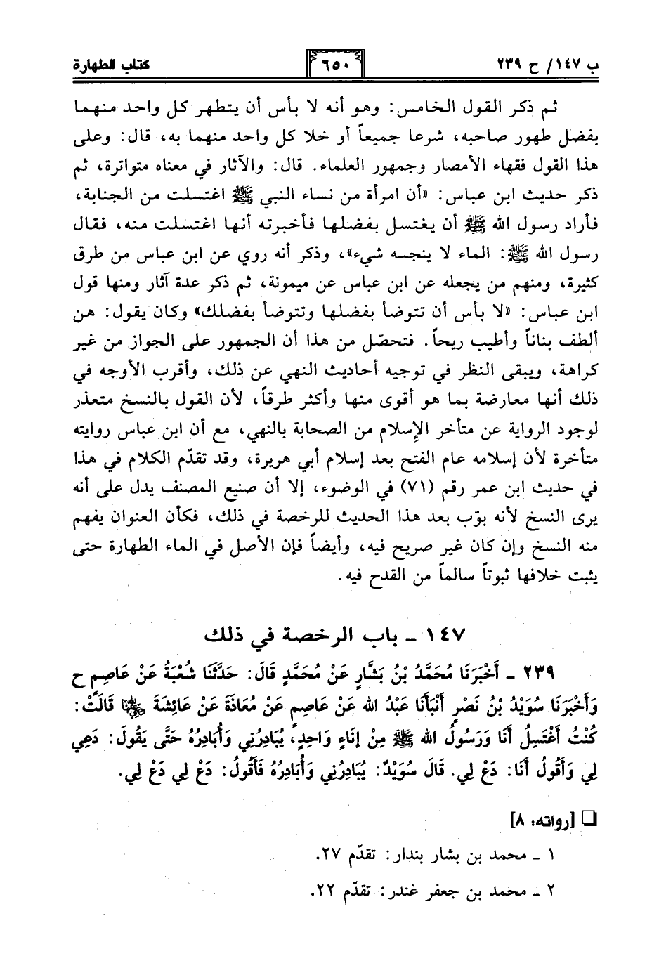 ثم ذكر القول الخامس: وهو أنه لا بأس أن يتطهر كل واحد منهما بفضل طهور صاحبه، شرعا جميعًا أو خلا كل واحد منهما به، قال: وعلى هذا القول فقهاء الأمصار وجمهور العلماء. قال: والآثار في معناه متواترة، ثم ذكر حديث ابن عباس: "أن امرأة من نساء النبي - صلى الله عليه وسلم - اغتسلت من الجنابة، فأراد رسول الله - صلى الله عليه وسلم - أن يغتسل بفضلها فأخبرته أنها اغتسلت منه، فقال رسول الله - صلى الله عليه وسلم -: الماء لا ينجسه شيء"، وذكر أنه روي عن ابن عباس من طرق كثيرة، ومنهم من يجعله عن ابن عباس عن ميمونة، ثم ذكر عدة آثار ومنها قول ابن عباس: "لا بأس أن تتوضأ بفضلها وتتوضأ بفضلك" وكان يقول: هن ألطف بنانًا وأطيب ريحًا. فتحصل من هذا أن الجمهور على الجواز من غير كراهة، ويبقى النظر في توجيه أحاديث النهي عن ذلك، وأقرب الأوجه في ذلك أنها معارضة بما هو أقوى منها وأكثر طرقًا, لأن القول بالنسخ متعذر لوجود الرواية عن متأخر الإِسلام من الصحابة بالنهي، مع أن ابن عباس روايته متأخرة لأن إسلامه عام الفتح بعد إسلام أبي هريرة، وقد تقدّم الكلام في هذا في حديث ابن عمر رقم (71) في الوضوء، إلا أن صنيع المصنف يدل على أنه يرى النسخ لأنه بوّب بعد هذا الحديث للرخصة في ذلك، فكأن العنوان يفهم منه النسخ وإن كان غير صريح فيه، وأيضًا فإن الأصل في الماء الطهارة حتى يثبت خلافها ثبوتًا سالمًا من القدح فيه.