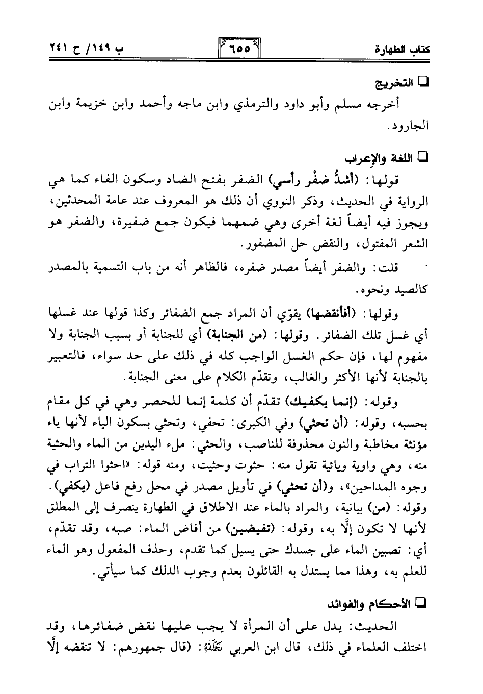 وقوله: (إنما يكفيك) تقدّم أن كلمة إنما للحصر وهي في كل مقام بحسبه، وقوله: (أن تحثي) وفي الكبرى: تحفي، وتحثي بسكون الياء لأنها ياء مؤنثة مخاطبة والنون محذوفة للناصب، والحثي: ملء اليدين من الماء والحثية منه، وهي واوية ويائية تقول منه: حثوت وحثيت، ومنه قوله: "احثوا التراب في وجوه المداحين"، و (أن تحثي) في تأويل مصدر في محل رفع فاعل (يكفي). وقوله: (من) بيانية، والمراد بالماء عند الإطلاق في الطهارة ينصرف إلى المطلق لأنها لا تكون إلا به، وقوله: (تفيضين) من أفاض الماء: صبه، وقد تقدّم، أي: تصبين الماء على جسدك حتى يسيل كما تقدم، وحذف المفعول وهو الماء للعلم به، وهذا مما يستدل به القائلون بعدم وجوب الدلك كما سيأتي.