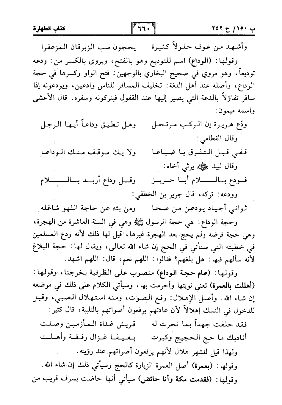 وقولها: (عام حجة الوداع) منصوب على الظرفية بخرجنا، وقولها: (أهللت بالعمرة) تعني نويتها وأحرمت بها، وسيأتي الكلام على ذلك في موضعه إن شاء الله. وأصل الإِهلال: رفع الصوت، ومنه استهلال الصبي، وقيل للدخول في النسك إهلالًا لأن عادتهم يرفعون أصواتهم بالتلبية، قال كثير: