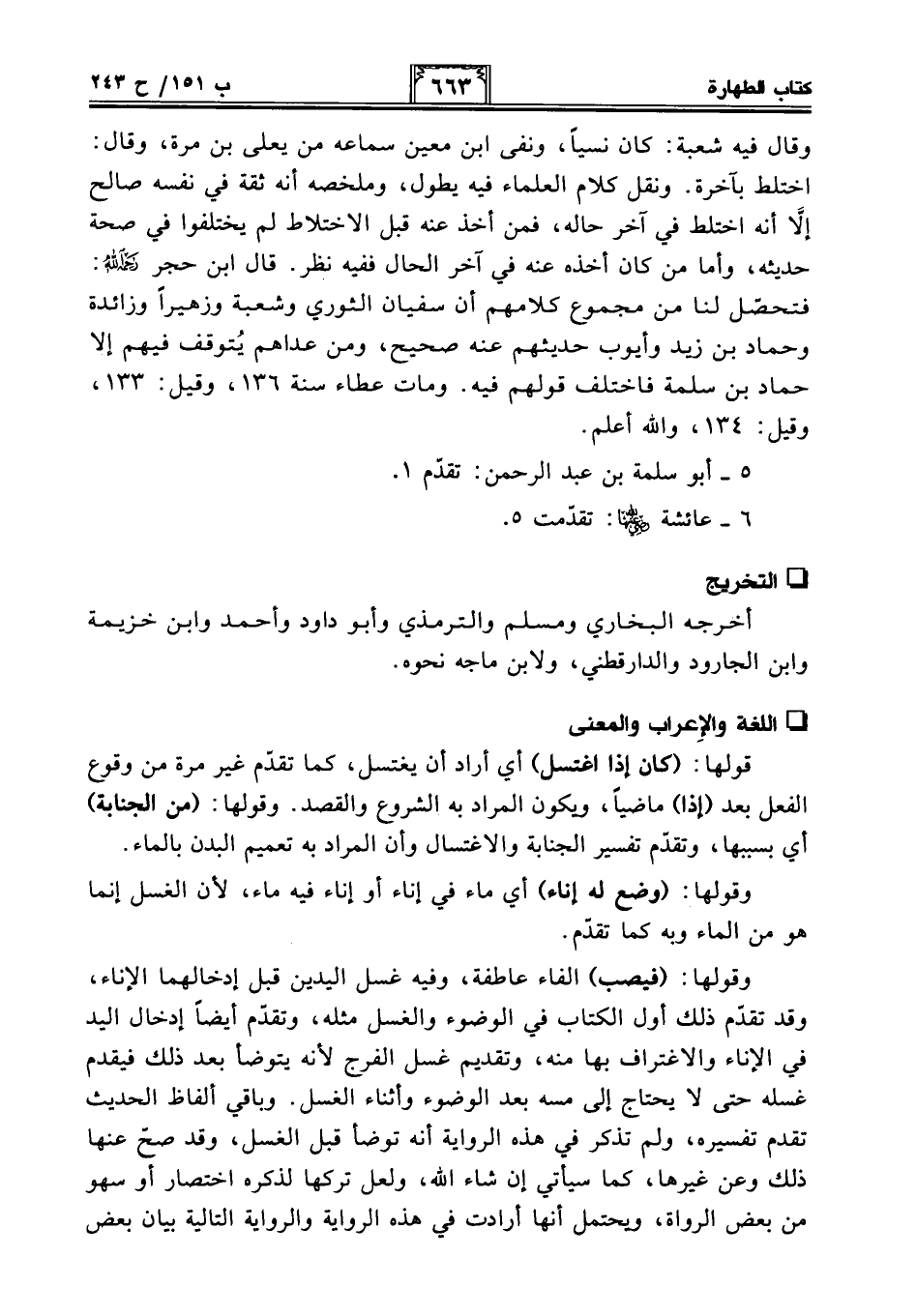 وقولها: (فيصب) الفاء عاطفة، وفيه غسل اليدين قبل إدخالهما الإناء، وقد تقدم ذلك أول الكتاب في الوضوء والغسل مثله، وتقدم أيضًا إدخال اليد في الإناء والاغتراف بها منه، وتقديم غسل الفرج لأنه يتوضأ بعد ذلك فيقدم غسله حتى لا يحتاج إلى مسه بعد الوضوء وأثناء الغسل. وباقي ألفاظ الحديث تقدم تفسيره، ولم تذكر في هذه الرواية أنه توضأ قبل الغسل، وقد صح عنها ذلك وعن غيرها، كما سيأتي إن شاء الله، ولعل تركها لذكره إختصار أو سهو من بعض الرواة، ويحتمل أنها أرادت في هذه الرواية والرواية التالية بيان بعض
