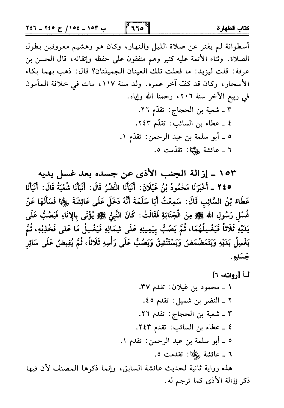 245 - أَخْبَرَنَا مَحْمُودُ بْنُ غَيْلَانَ: أَنْبَأَنَا النَّضْرُ قَالَ: أَنْبَأَنَا شُعْبَةُ قَالَ: أَنْبَأَنَا عَطَاءُ بْنُ السَّائِبِ قَالَ: سَمِعْتُ أَبَا سَلَمَةَ أَنَّهُ دَخَلَ عَلَى عَائِشَةَ -رضي الله عنها- فَسَأَلَهَا عَنْ غُسْلِ رَسُولِ اللَّهِ - صلى الله عليه وسلم - مِنَ الْجَنَابَةِ فَقَالَتْ: كَانَ النَّبِيُّ - صلى الله عليه وسلم - يُؤْتَى بِالإِنَاءِ فَيَصُبُّ عَلَى يَدَيْهِ ثَلَاثًا فَيَغْسِلُهُمَا، ثُمَّ يَصُبُّ بِيَمِينِهِ عَلَى شِمَالِهِ فَيَغْسِلُ مَا عَلَى فَخِذَيْهِ، ثُمَّ يَغْسِلُ يَدَيْهِ وَيَتَمَضْمَضُ وَيَسْتَنْشِقُ وَيَصُبُّ عَلَى رَأْسِهِ ثَلَاثًا، ثُمَّ يُفِيضُ عَلَى سَائِرِ جَسَدِهِ.