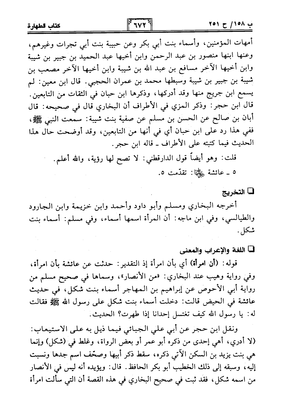 قوله: (أن امرأة) أي بأن امرأة إذ التقدير: حدثت عن عائشة بأن امرأة، وفي رواية وهيب عند البخاري: "من الأنصار"، وسماها في صحيح مسلم من رواية أبي الأحوص عن إبراهيم بن المهاجر أسماء بنت شكل، في حديث عائشة في الحيض قالت: دخلت أسماء بنت شكل على رسول الله - صلى الله عليه وسلم - فقالت له: يا رسول الله كيف تغتسل إحدانا إذا طهرت؟ الحديث.