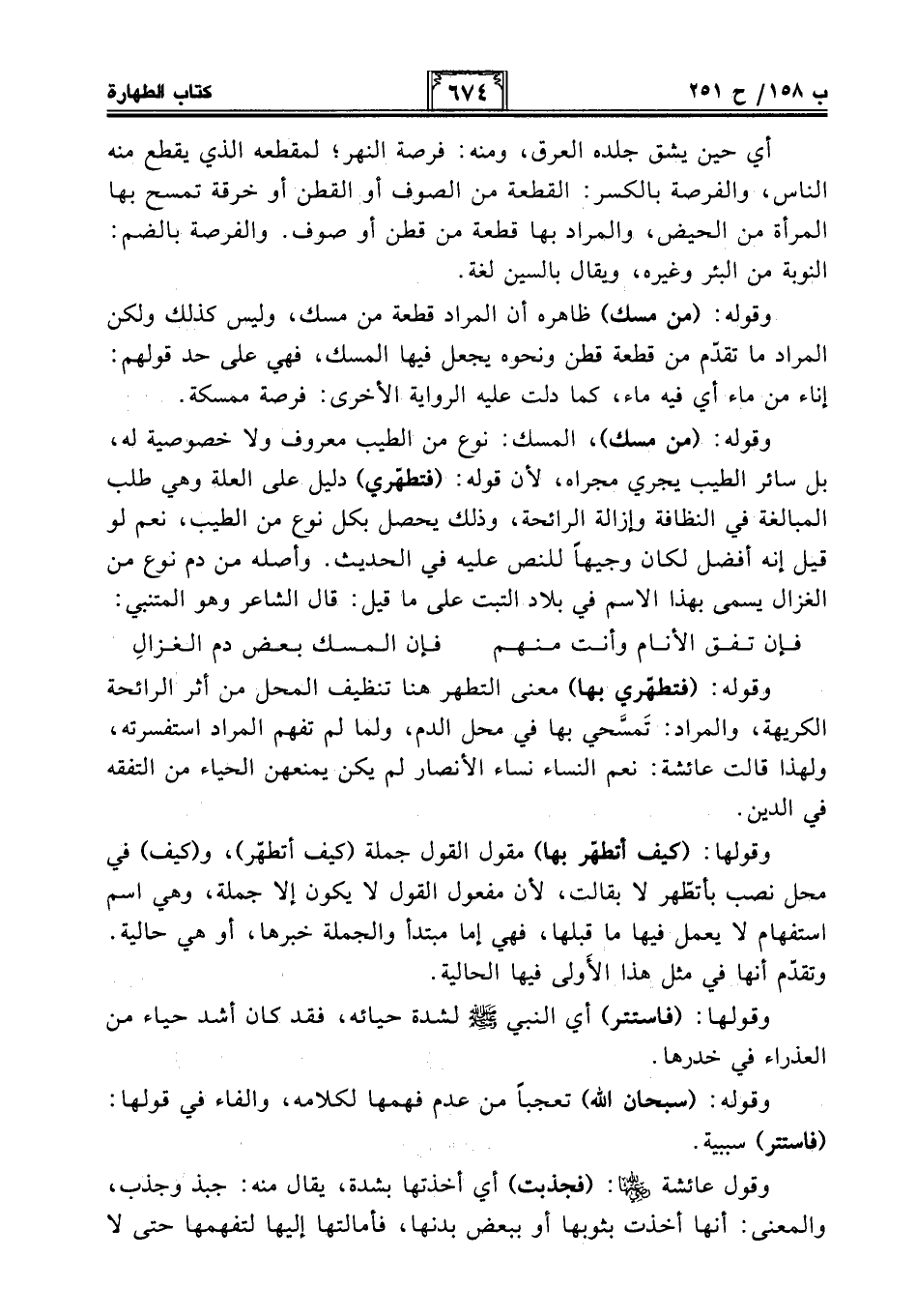 وقوله: (فتطهّري بها) معنى التطهر هنا تنظيف المحل من أثر الرائحة الكريهة، والمراد: تَمسَّحي بها في محل الدم، ولما لم تفهم المراد استفسرته، ولهذا قالت عائشة: نعم النساء نساء الأنصار لم يكن يمنعهن الحياء من التفقه في الدين.