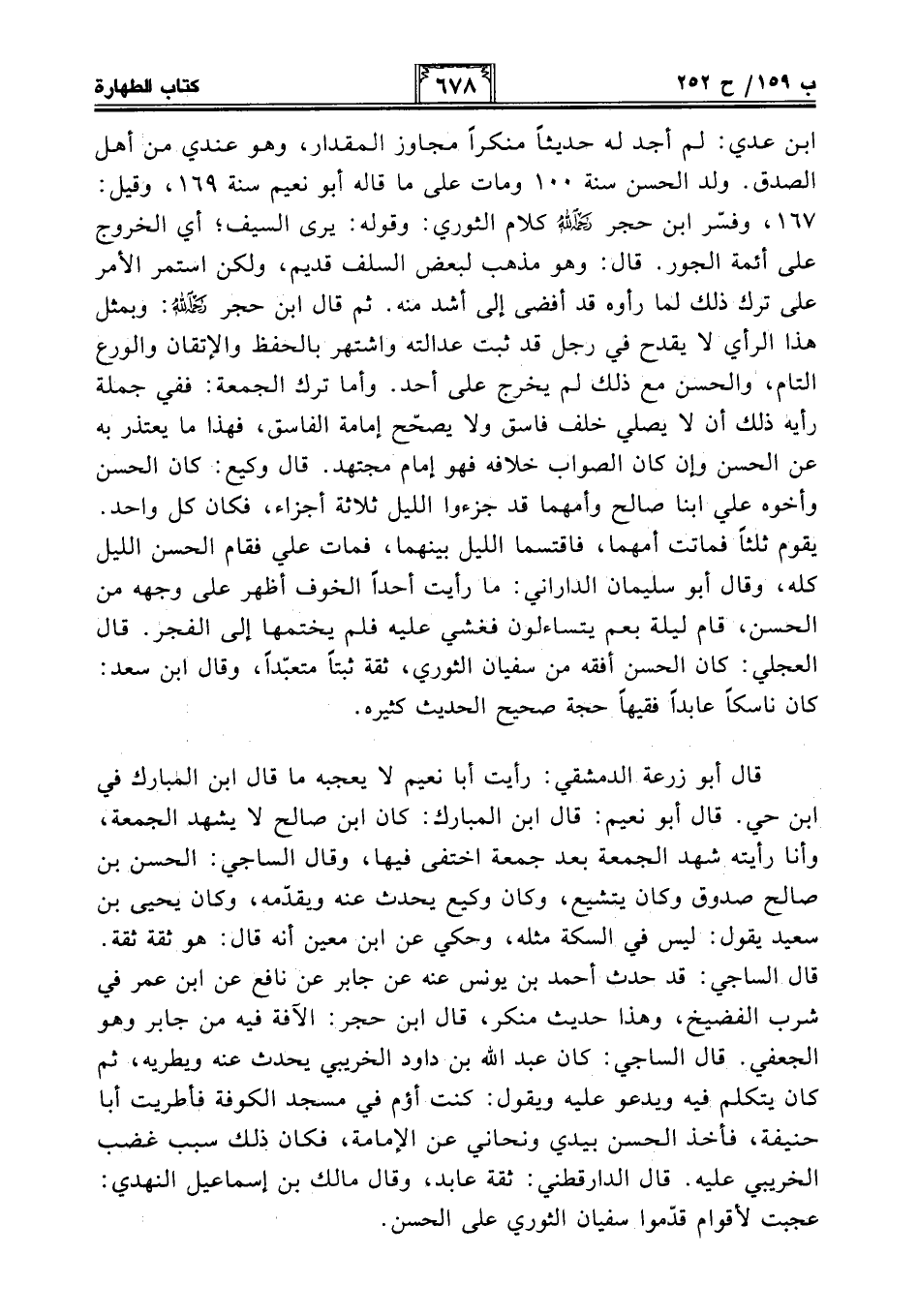 ابن عدي: لم أجد له حديثًا منكرًا مجاوز المقدار، وهو عندي من أهل الصدق. ولد الحسن سنة 100 ومات على ما قاله أبو نعيم سنة 169، وقيل: 167، وفسّر ابن حجر -رحمه اللهُ- كلام الثوري: وقوله: يرى السيف؛ أي الخروج على أئمة الجور. قال: وهو مذهب لبعض السلف قديم، ولكن استمر الأمر على ترك ذلك لما رأوه قد أفضى إلى أشد منه. ثم قال ابن حجر -رحمه الله-: وبمثل هذا الرأي لا يقدح في رجل قد ثبت عدالته واشتهر بالحفظ والإتقان والورع التام، والحسن مع ذلك لم يخرج على أحد. وأما ترك الجمعة: ففي جملة رأيه ذلك أن لا يصلي خلف فاسق ولا يصحّح إمامة الفاسق، فهذا ما يعتذر به عن الحسن وإن كان الصواب خلافه فهو إمام مجتهد. قال وكيع: كان الحسن وأخوه علي ابنا صالح وأمهما قد جزءوا الليل ثلاثة أجزاء، فكان كل واحد. يقوم ثلثًا فماتت أمهما، فاقتسما الليل بينهما، فمات علي فقام الحسن الليل كله، وقال أبو سليمان الداراني: ما رأيت أحدًا الخوف أظهر على وجهه من الحسن، قام ليلة بعم يتساءلون فغشي عليه فلم يختمها إلى الفجر. قال العجلي: كان الحسن أفقه من سفيان الثوري، ثقة ثبتًا متعبّدًا، وقال ابن سعد: كان ناسكًا عابدًا فقيهًا حجة صحيح الحديث كثيره.