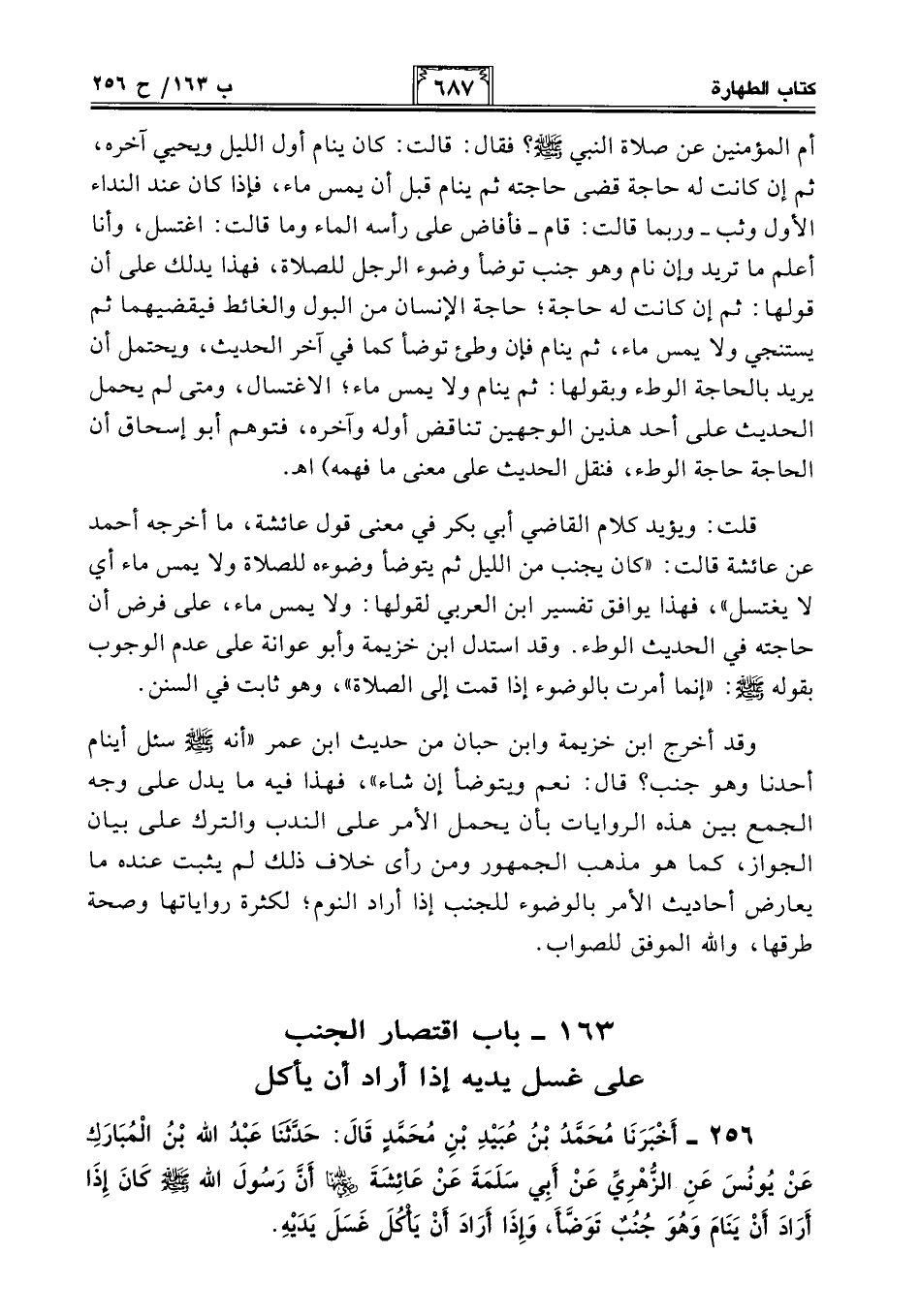أم المؤمنين عن صلاة النبي - صلى الله عليه وسلم -؟ فقال: قالت: كان ينام أول الليل ويحيي آخره، ثم إن كانت له حاجة قضى حاجته ثم ينام قبل أن يمس ماء، فإذا كان عند النداء الأول وثب -وربما قالت: قام- فأفاض على رأسه الماء وما قالت: اغتسل، وأنا أعلم ما تريد وإن نام وهو جنب توضأ وضوء الرجل للصلاة، فهذا يدلك على أن قولها: ثم إن كانت له حاجة؛ حاجة الإنسان من البول والغائط فيقضيهما ثم يستنجي ولا يمس ماء، ثم ينام فإن وطئ توضأ كما في آخر الحديث، ويحتمل أن يريد بالحاجة الوطء وبقولها: ثم ينام ولا يمس ماء؛ الإغتسال، ومتى لم يحمل الحديث على أحد هذين الوجهين تناقض أوله وآخره، فتوهم أبو إسحاق أن الحاجة حاجة الوطء، فنقل الحديث على معنى ما فهمه) اهـ.