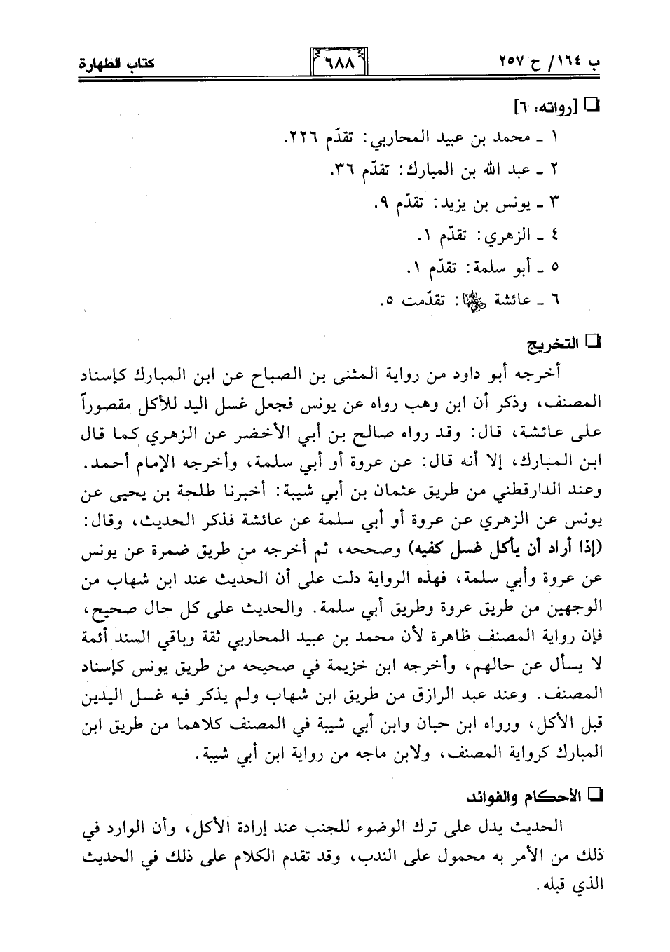 أخرجه أبو داود من رواية المثنى بن الصباح عن ابن المبارك كإسناد المصنف، وذكر أن ابن وهب رواه عن يونس فجعل غسل اليد للأكل مقصورًا على عائشة، قال: وقد رواه صالح بن أبي الأخضر عن الزهري كما قال ابن المبارك، إلا أنه قال: عن عروة أو أبي سلمة، وأخرجه الإِمام أحمد. وعند الدارقطني من طريق عثمان بن أبي شيبة: أخبرنا طلحة بن يحيى عن يونس عن الزهري عن عروة أو أبي سلمة عن عائشة فذكر الحديث، وقال: (إذا أراد أن يأكل غسل كفيه) وصححه، ثم أخرجه من طريق ضمرة عن يونس عن عروة وأبي سلمة، فهذه الرواية دلت على أن الحديث عند ابن شهاب من الوجهين من طريق عروة وطريق أبي سلمة. والحديث على كل حال صحيح، فإن رواية المصنف ظاهرة لأن محمَّد بن عبيد المحاربي ثقة وباقي السند أئمة لا يسأل عن حالهم، وأخرجه ابن خزيمة في صحيحه من طريق يونس كإسناد المصنف. وعند عبد الرازق من طريق ابن شهاب ولم يذكر فيه غسل اليدين قبل الأكل، ورواه ابن حبان وابن أبي شيبة في المصنف كلاهما من طريق ابن المبارك كرواية المصنف، ولابن ماجه من رواية ابن أبي شيبة.