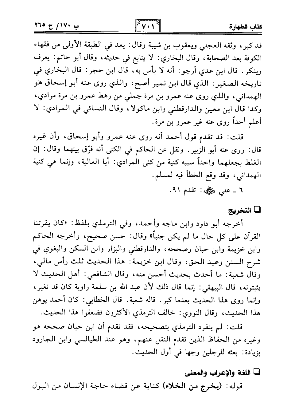 أخرجه أبو داود وابن ماجه وأحمد، وفي الترمذي بلفظ: "كان يقرئنا القرآن على كل حال ما لم يكن جنبًا" وقال: حسن صحيح، وأخرجه الحاكم وابن خزيمة وابن حبان وصححه، والدارقطني والبزار وابن السكن والبغوي في شرح السنن وعبد الحق، وقال ابن خزيمة: هذا الحديث ثلث رأس مالي، وقال شعبة: ما أحدث بحديث أحسن منه، وقال الشافعي: أهل الحديث لا يثبتونه، قال البيهقي: إنما قال ذلك لأن عبد الله بن سلمة راوية كان قد تغير، وإنما روى هذا الحديث بعدما كبر. قاله شعبة. قال الخطابي: كان أحمد يوهن هذا الحديث، وقال النووي: خالف الترمذي الأكثرون فضعفوا هذا الحديث.