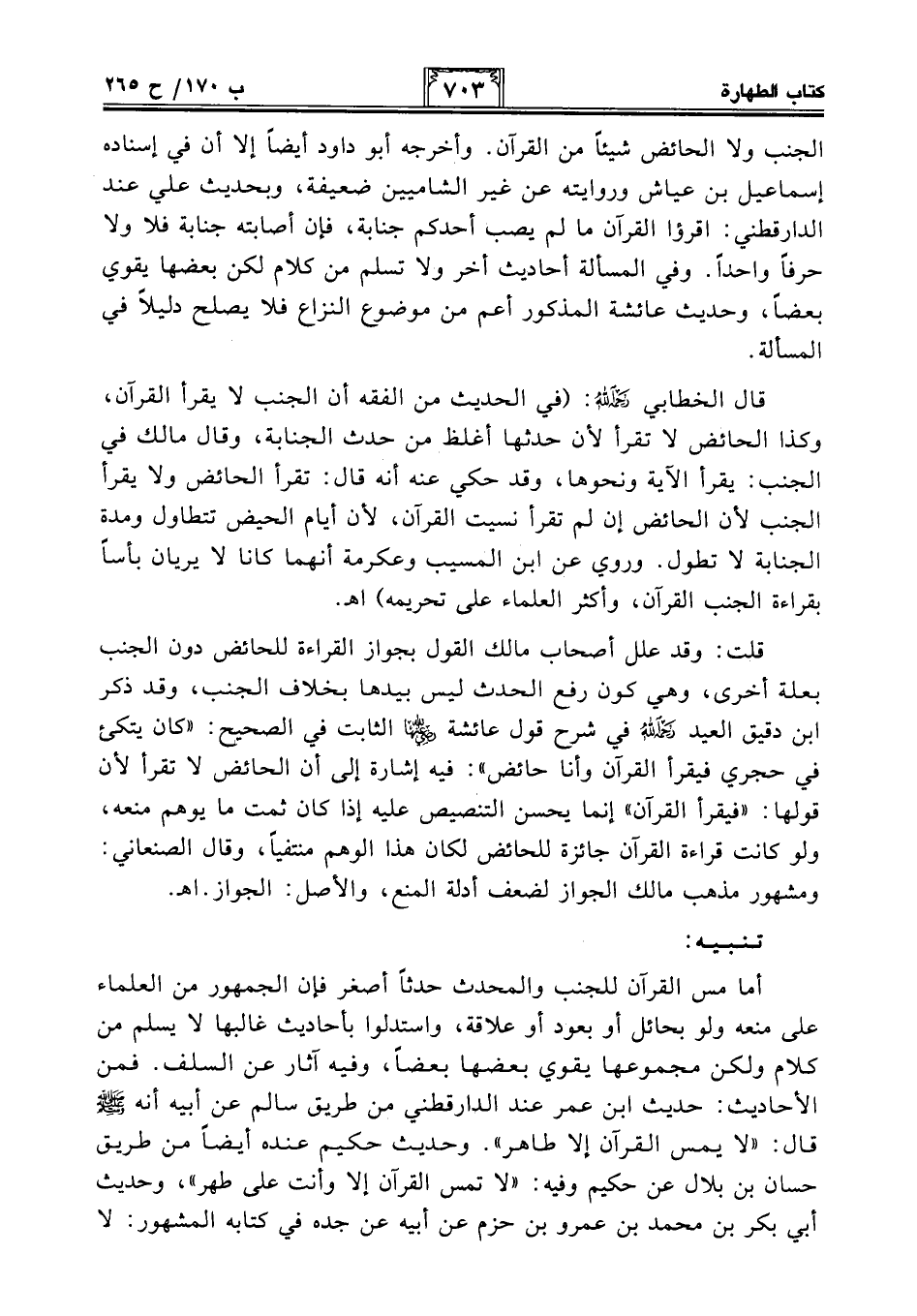 الجنب ولا الحائض شيئًا من القرآن. وأخرجه أبو داود أيضًا إلا أن في إسناده إسماعيل بن عياش وروايته عن غير الشاميين ضعيفة، وبحديث علي عند الدارقطني: اقرؤا القرآن ما لم يصب أحدكم جنابة، فإن أصابته جنابة فلا ولا حرفًا واحدًا. وفي المسألة أحاديث أخر ولا تسلم من كلام لكن بعضها يقوي بعضًا، وحديث عائشة المذكور أعم من موضوع النزاع فلا يصلح دليلًا في المسألة.