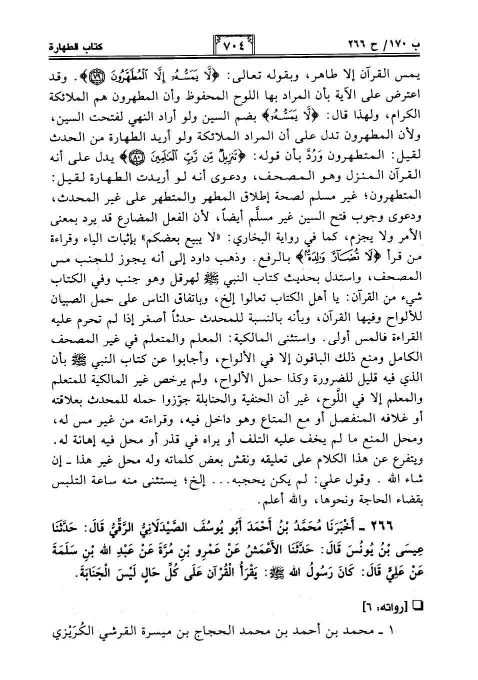 يمس القرآن إلا طاهر، وبقوله تعالى: {لَا يَمَسُّهُ إِلَّا الْمُطَهَّرُونَ (79)}. وقد اعترض على الآية بأن المراد بها اللوح المحفوظ وأن المطهرون هم الملائكة الكرام، ولهذا قال: {لَا يَمَسُّهُ} بضم السين ولو أراد النهي لفتحت السين، ولأن المطهرون تدل على أن المراد الملائكة ولو أريد الطهارة من الحدث لقيل: المتطهرون وَرُدَّ بأن قوله: {تَنْزِيلٌ مِنْ رَبِّ الْعَالَمِينَ (80)} يدل على أنه القرآن المنزل وهو المصحف، ودعوى أنه لو أريدت الطهارة لقيل: المتطهرون؛ غير مسلم لصحة إطلاق المطهر والمتطهر على غير المحدث، ودعوى وجوب فتح السين غير مسلَّم أيضًا، لأن الفعل المضارع قد يرد بمعنى الأمر ولا يجزم، كما في رواية البخاري: "لا يبيع بعضكم" بإثبات الياء وقراءة من قرأ {لَا تُضَارَّ وَالِدَةٌ} بالرفع. وذهب داود إلى أنه يجوز للجنب مس المصحف، واستدل بحديث كتاب النبي - صلى الله عليه وسلم - لهرقل وهو جنب وفي الكتاب شيء من القرآن: يا أهل الكتاب تعالوا إلخ، وباتفاق الناس على حمل الصبيان للألواح وفيها القرآن، وبأنه بالنسبة للمحدث حدثًا أصغر إذا لم تحرم عليه القراءة فالمس أولى. واستثنى المالكية: المعلم والمتعلم في غير المصحف الكامل ومنع ذلك الباقون إلا في الألواح، وأجابوا عن كتاب النبي - صلى الله عليه وسلم - بأن الذي فيه قليل للضرورة وكذا حمل الألواح، ولم يرخص غير المالكية للمتعلم والمعلم إلا في اللَّوح، غير أن الحنفية والحنابلة جوّزوا حمله للمحدث بعلاقته أو غلافه المنفصل أو مع المتاع وهو داخل فيه، وقراءته من غير مس له، ومحل المنع ما لم يخف عليه التلف أو يراه في قذر أو محل فيه إهانة له. ويتفرع عن هذا الكلام على تعليقه ونقش بعض كلماته وله محل غير هذا -إن شاء الله. وقول علي: لم يكن يحجبه. . . إلخ؛ يستثنى منه ساعة التلبس بقضاء الحاجة ونحوها، والله أعلم.