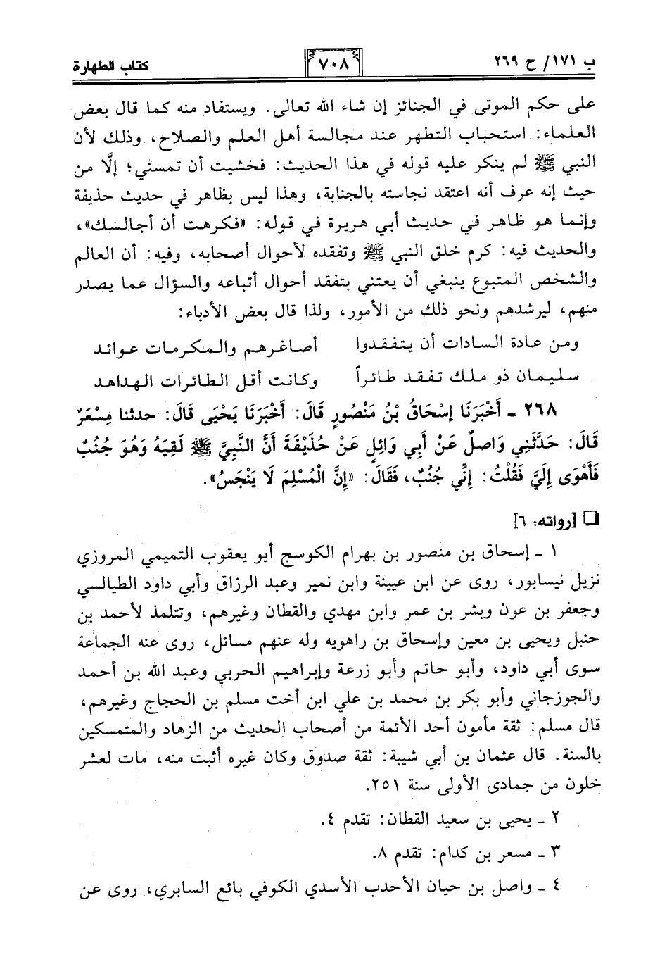 268 - أَخْبَرَنَا إِسْحَاقُ بْنُ مَنْصُورٍ قَالَ: أَخْبَرَنَا يَحْيَى قَالَ: حَدَّثَنَا مِسْعَرٌ قَالَ: حَدَّثَنِي وَاصِلٌ عَنْ أَبِي وَائِلٍ عَنْ حُذَيْفَةَ أَنَّ النَّبِيَّ - صلى الله عليه وسلم - لَقِيَهُ وَهُوَ جُنُبٌ فَأَهْوَى إِلَيَّ فَقُلْتُ: إِنِّى جُنُبٌ، فَقَالَ: "إِنَّ الْمُسْلِمَ لَا يَنْجَسُ".