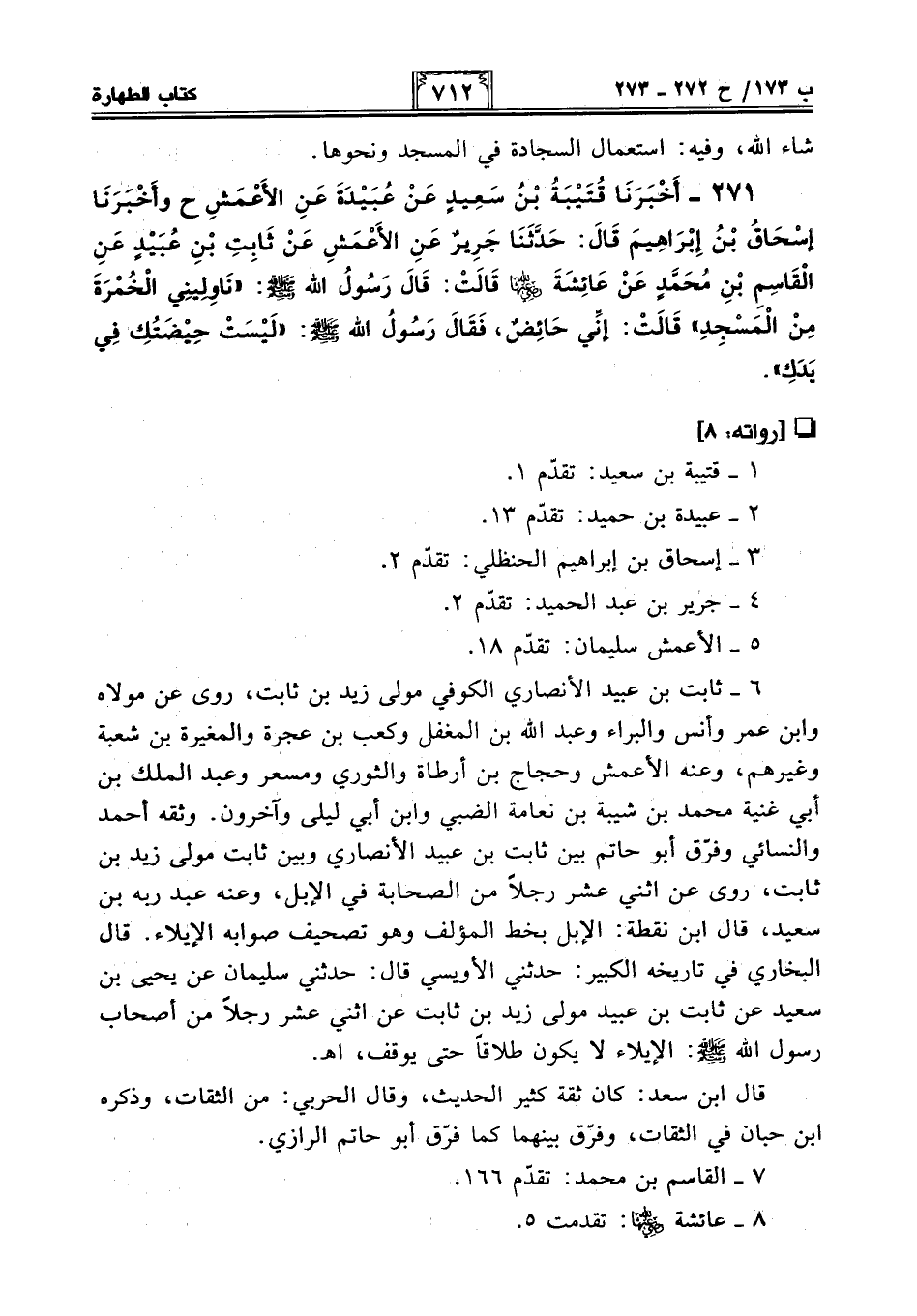 271 - أَخْبَرَنَا قُتَيْبَةُ بْنُ سَعِيدٍ عَنْ عَبِيدَةَ عَنِ الأَعْمَشِ ح وَأَخْبَرَنَا إِسْحَاقُ بْنُ إِبْرَاهِيمَ قَالَ: حَدَّثَنَا جَرِيرٌ عَنِ الأَعْمَشِ عَنْ ثَابِتِ بْنِ عُبَيْدٍ عَنِ الْقَاسِمِ بْنِ مُحَمَّدٍ عَنْ عَائِشَةَ -رضي الله عنها- قَالَتْ: قَالَ رَسُولُ اللَّهِ - صلى الله عليه وسلم -: "نَاوِلِينِي الْخُمْرَةَ مِنَ الْمَسْجِدِ" قَالَتْ: إِنِّي حَائِضٌ، فَقَالَ رَسُولُ اللَّهِ - صلى الله عليه وسلم -: "لَيْسَتْ حَيْضَتُكِ فِي يَدِكِ".