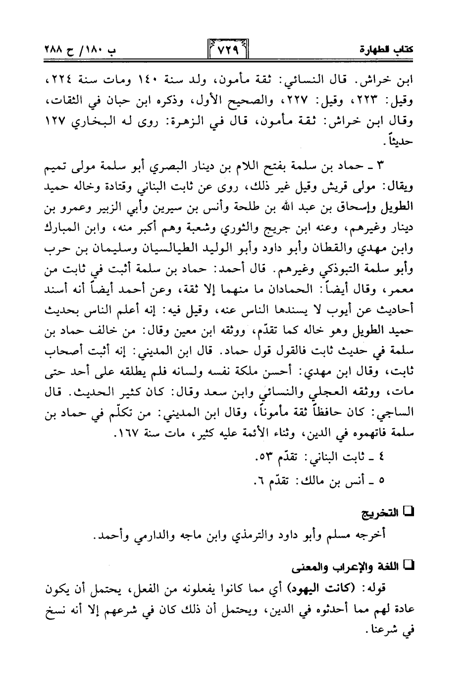 3 - حماد بن سلمة بفتح اللام بن دينار البصري أبو سلمة مولى تميم ويقال: مولى قريش وقيل غير ذلك، روى عن ثابت البناني وقتادة وخاله حميد الطويل وإسحاق بن عبد الله بن طلحة وأنس بن سيرين وأبي الزبير وعمرو بن دينار وغيرهم، وعنه ابن جريج والثوري وشعبة وهم أكبر منه، وابن المبارك وابن مهدي والقطان وأبو داود وأبو الوليد الطيالسيان وسليمان بن حرب وأبو سلمة التبوذكي وغيرهم. قال أحمد: حماد بن سلمة أثبت في ثابت من معمر، وقال أيضًا: الحمادان ما منهما إلا ثقة، وعن أحمد أيضًا أنه أسند أحاديث عن أيوب لا يسندها الناس عنه، وقيل فيه: إنه أعلم الناس بحديث حميد الطويل وهو خاله كما تقدّم، ووثقه ابن معين وقال: من خالف حماد بن سلمة في حديث ثابت فالقول قول حماد. قال ابن المديني: إنه أثبت أصحاب ثابت، وقال ابن مهدي: أحسن ملكة نفسه ولسانه فلم يطلقه على أحد حتى مات، ووثقه العجلي والنسائي وابن سعد وقال: كان كثير الحديث. قال الساجي: كان حافظًا ثقة مأمونًا، وقال ابن المديني: من تكلّم في حماد بن سلمة فاتهموه في الدين، وثناء الأئمة عليه كثير، مات سنة 167.