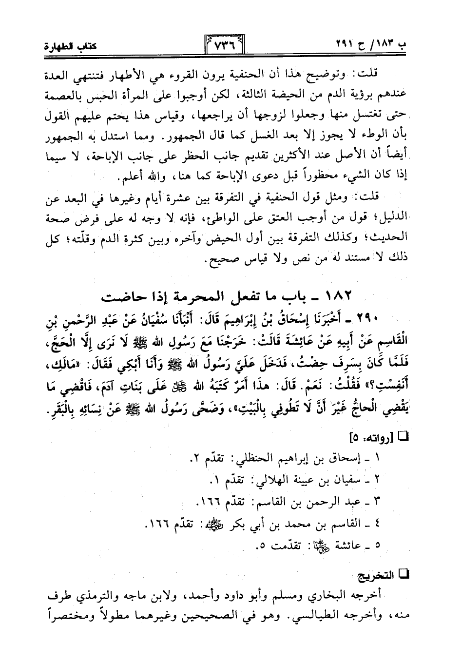 290 - أَخْبَرَنَا إِسْحَاقُ بْنُ إِبْرَاهِيمَ قَالَ: أَنْبَأَنَا سُفْيَانُ عَنْ عَبْدِ الرَّحْمَنِ بْنِ الْقَاسِمِ عَنْ أَبِيهِ عَنْ عَائِشَةَ قَالَتْ: خَرَجْنَا مَعَ رَسُولِ اللَّهِ - صلى الله عليه وسلم - لَا نُرَى إِلَّا الْحَجَّ، فَلَمَّا كَانَ بِسَرِفَ حِضْتُ، فَدَخَلَ عَلَيَّ رَسُولُ اللَّهِ - صلى الله عليه وسلم - وَأَنَا أَبْكِي فَقَالَ: "مَا لَكِ، أَنَفِسْتِ؟ " فَقُلْتُ: نَعَمْ. قَالَ: هَذَا أَمْرٌ كَتَبَهُ اللَّهُ -عَزَّ وَجَلَّ- عَلَى بَنَاتِ آدَمَ، فَاقْضِي مَا يَقْضِي الْحَاجُّ غَيْرَ أَنْ لَا تَطُوفِي بِالْبَيْتِ"، وَضَحَّى رَسُولُ اللَّهِ - صلى الله عليه وسلم - عَنْ نِسَائِهِ بِالْبَقَرِ.