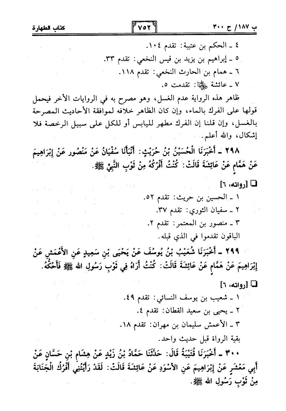 298 - أَخْبَرَنَا الْحُسَيْنُ بْنُ حُرَيْثٍ: أَنْبَأَنَا سُفْيَانُ عَنْ مَنْصُورٍ عَنْ إِبْرَاهِيمَ عَنْ هَمَّامٍ عَنْ عَائِشَةَ قَالَتْ: كُنْتُ أَفْرُكُهُ مِنْ ثَوْبِ النَّبِيِّ - صلى الله عليه وسلم -.