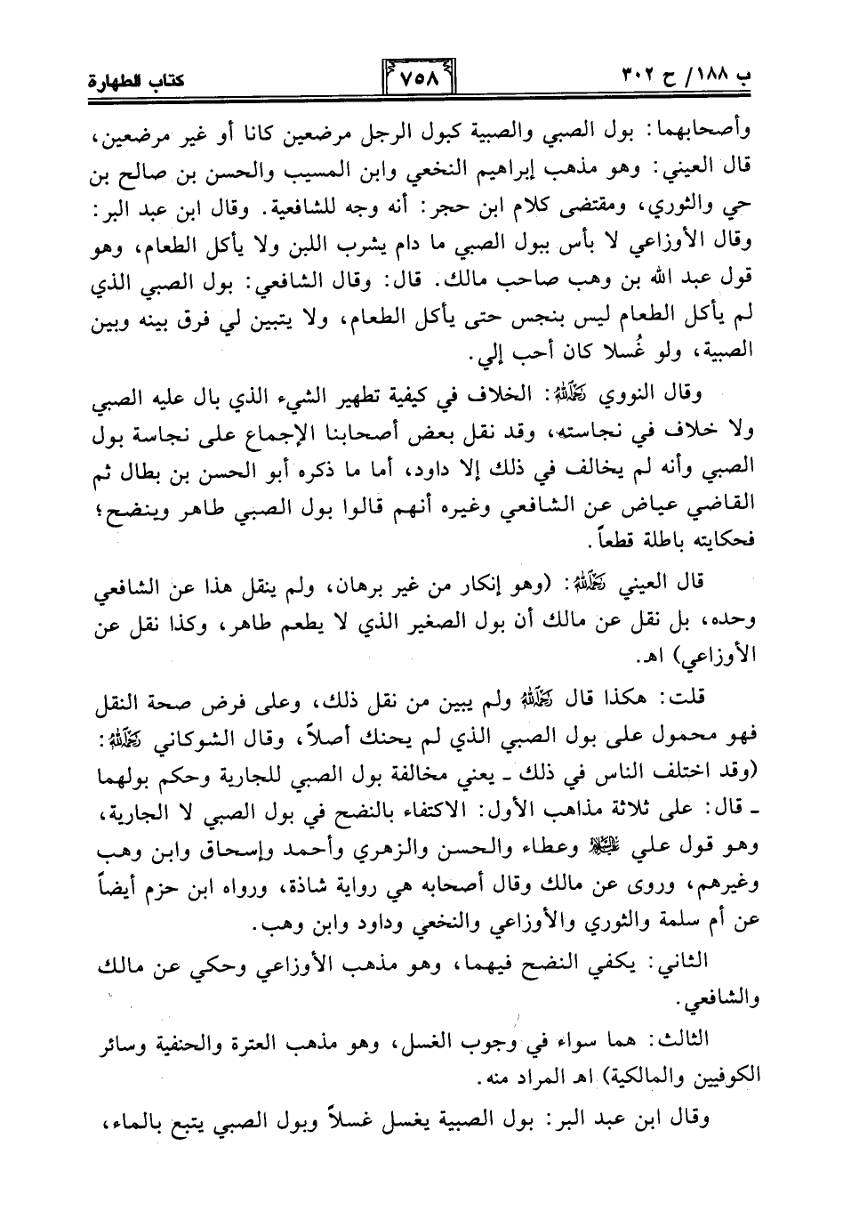 وقال النووي -رحمه الله-: الخلاف في كيفية تطهير الشيء الذي بال عليه الصبي ولا خلاف في نجاسته، وقد نقل بعض أصحابنا الإجماع على نجاسة بول الصبي وأنه لم يخالف في ذلك إلا داود، أما ما ذكره أبو الحسن بن بطال ثم القاضي عياض عن الشافعي وغيره أنهم قالوا بول الصبي طاهر وينضح؛ فحكايته باطلة قطعًا.