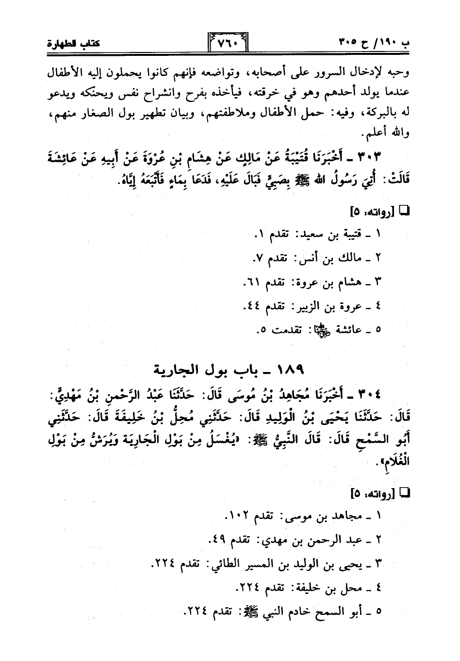 303 - أَخْبَرَنَا قُتَيْبَةُ عَنْ مَالِكٍ عَنْ هِشَامِ بْنِ عُرْوَةَ عَنْ أَبِيهِ عَنْ عَائِشَةَ قَالَتْ: أُتِيَ رَسُولُ اللَّهِ - صلى الله عليه وسلم - بِصَبِيٍّ فَبَالَ عَلَيْهِ، فَدَعَا بِمَاءٍ فَأَتْبَعَهُ إِيَّاهُ.